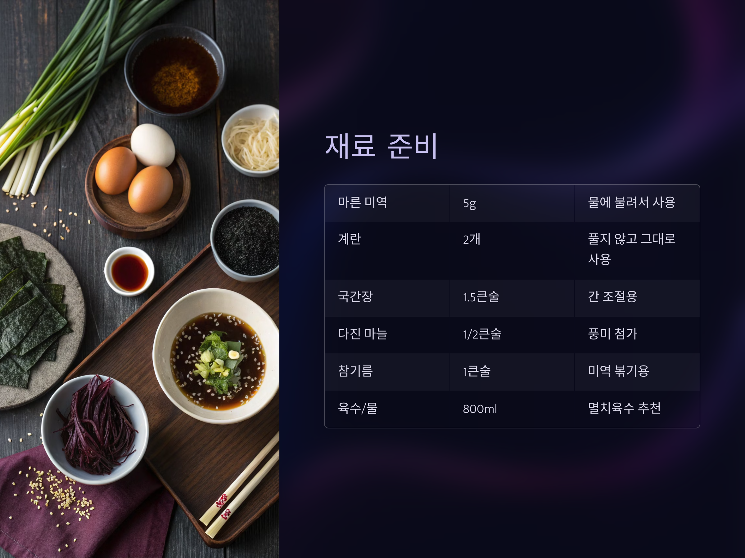 | 마른 미역 | 5g | 물에 불려서 사용 |