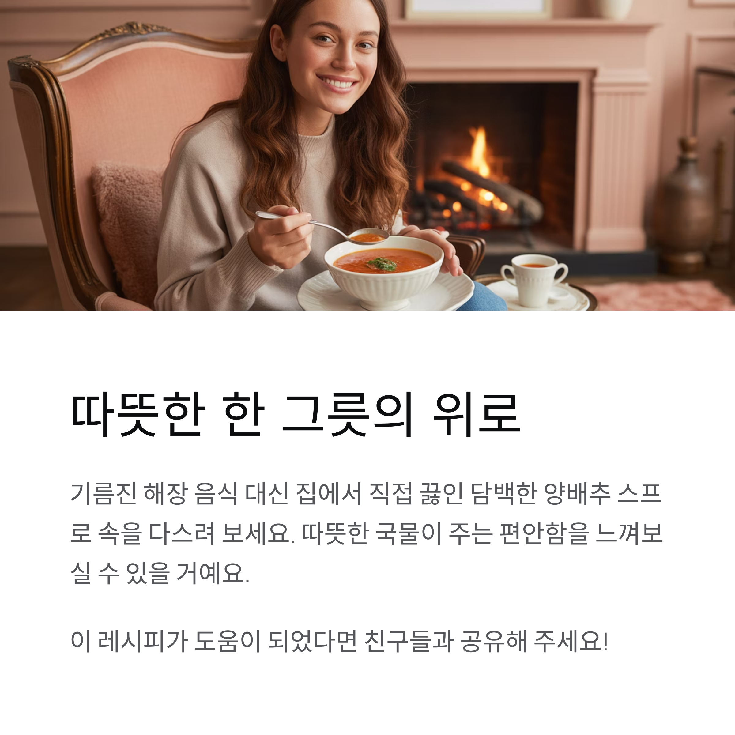 이럴 때 기름지고 자극적인 해장 음식 대신, 따뜻하고 담백한 양배추 스프를 끓여 먹으면 속이 한결 편안해집니다.