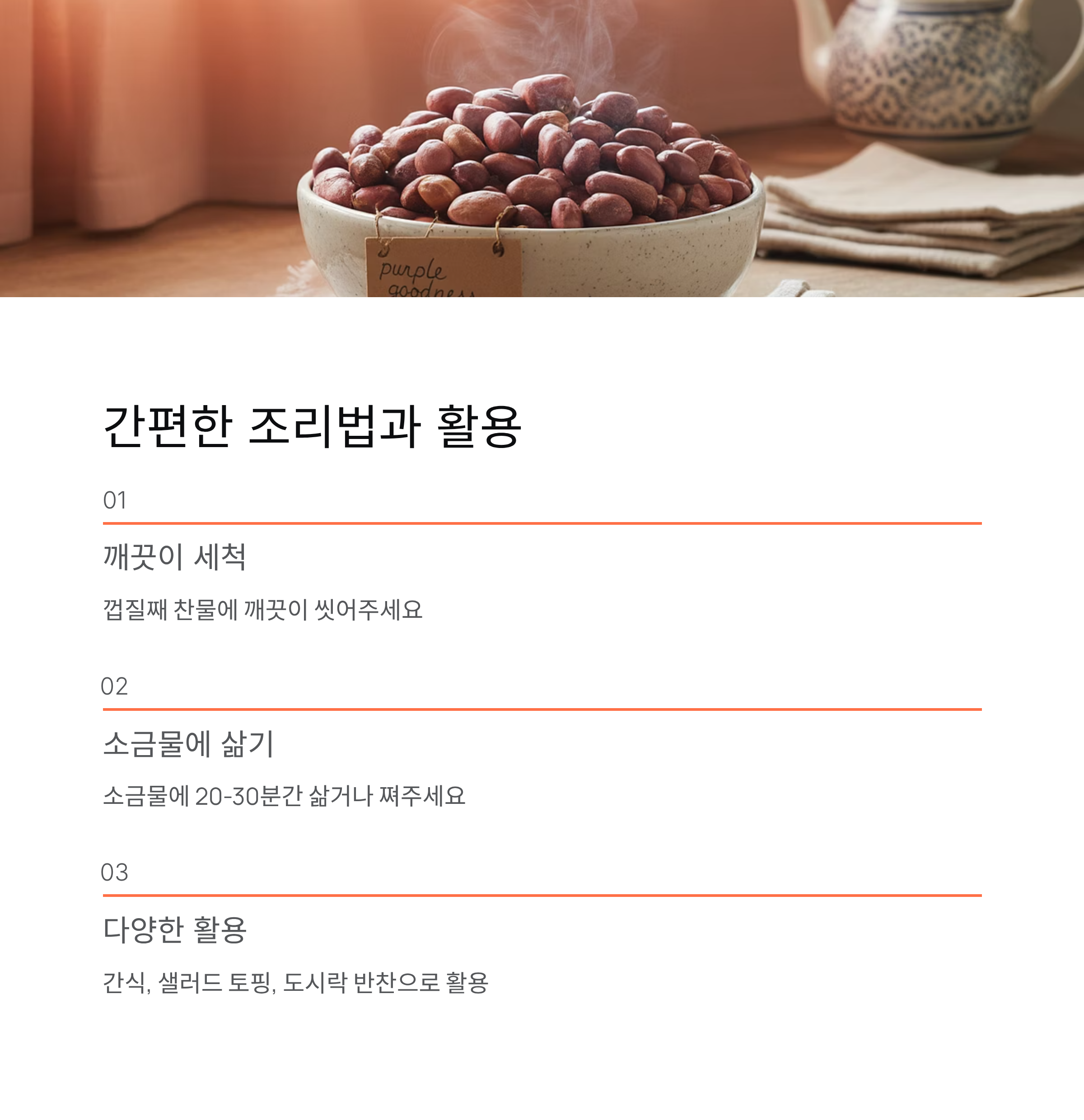 껍질째 깨끗이 씻은 후 소금물에 삶거나 쪄주시면 고소한 자색땅콩이 완성됩니다.