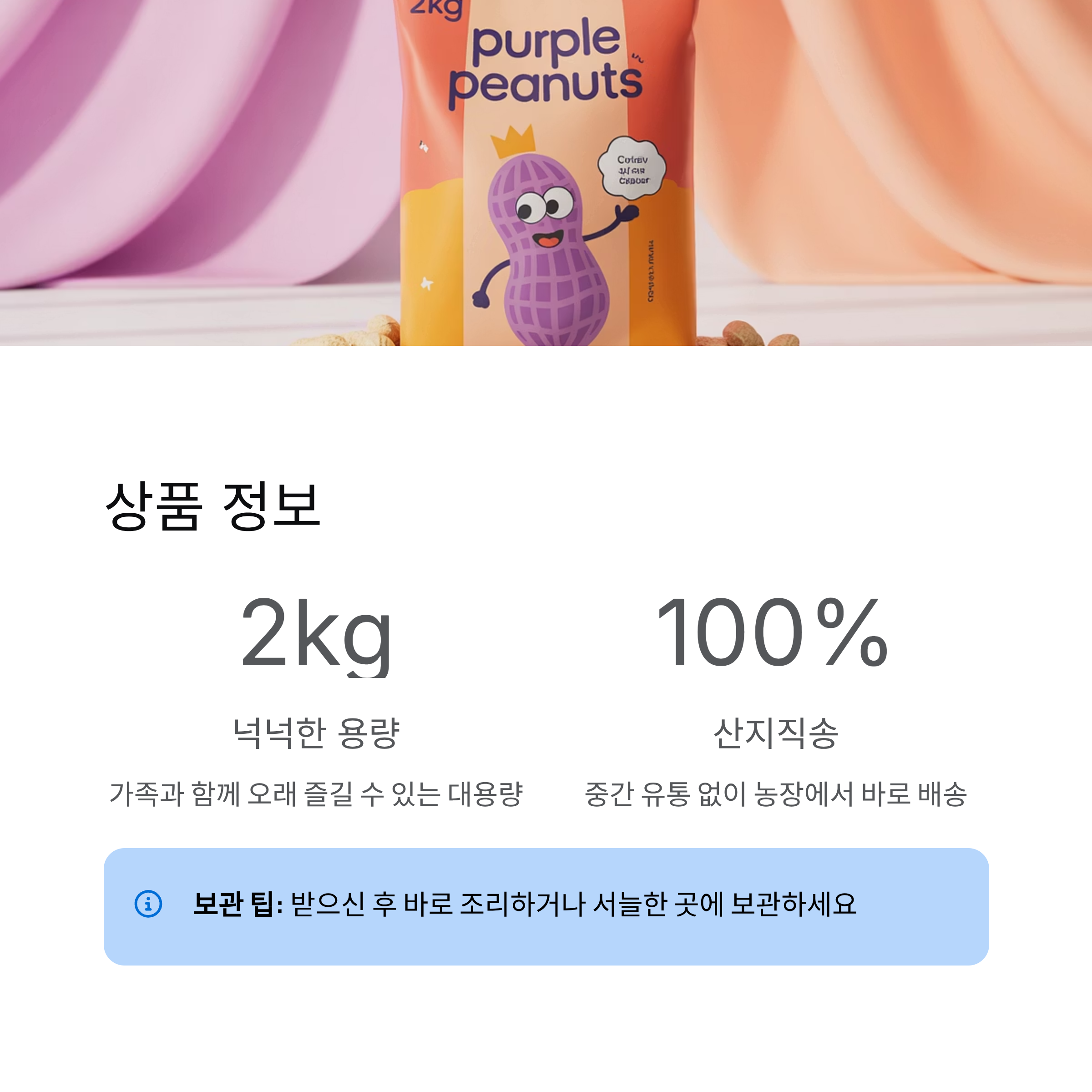 남은 땅콩은 서늘한 곳이나 냉동 보관을 추천드리며, 안전한 포장으로 신선도를 지켜 배송됩니다.