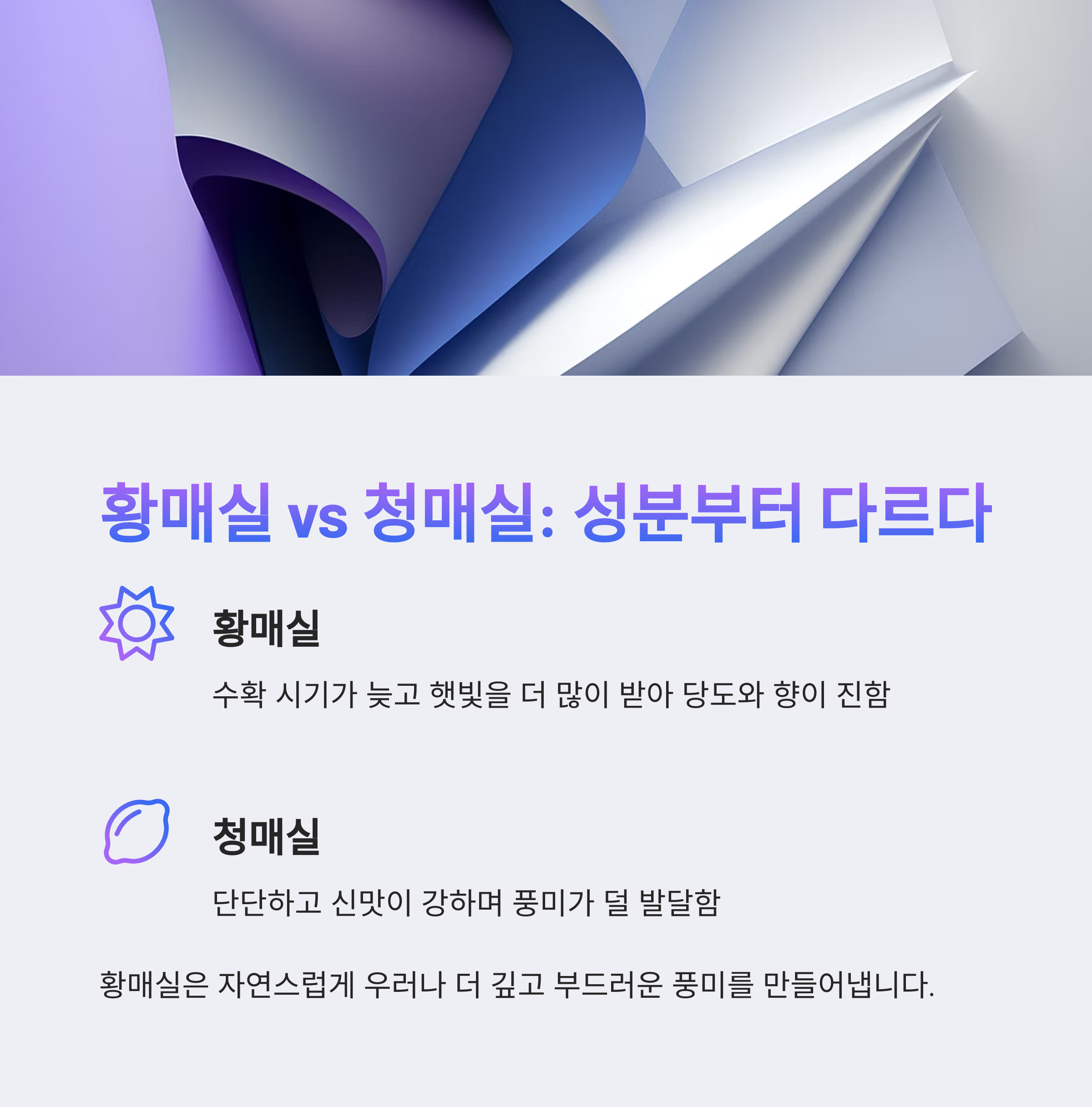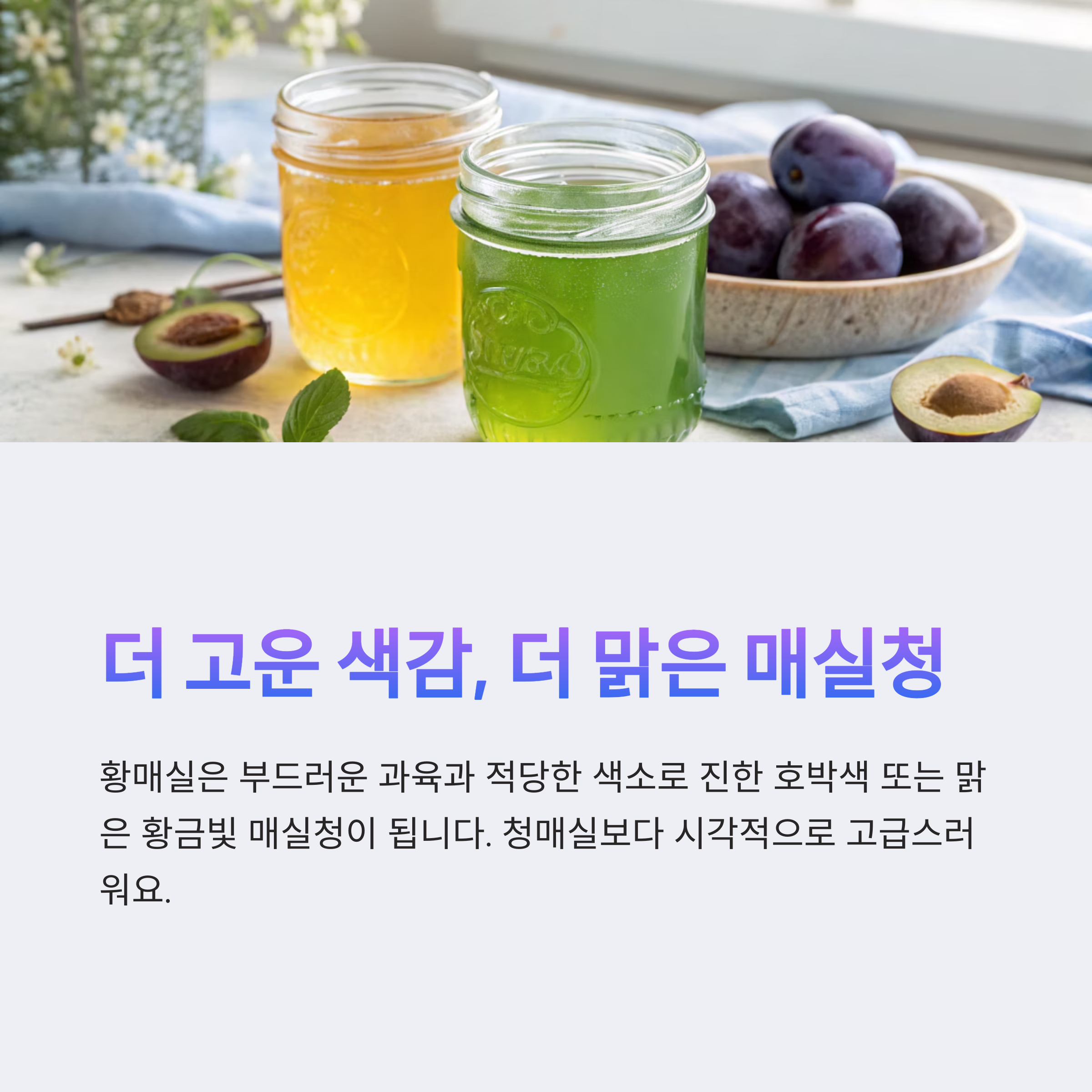 초여름이면 많은 분들이 매실청을 담그기 시작합니다. 그런데 ‘청매실’ 대신 ‘황매실’을 선택한 분들은 한결같이 말합니다. “향이 다르다”, “풍미가 더 깊다”. 도대체 무엇이 달라서 맛 차이가 나는 걸까요? 이번 글에서는 황매실로 담근 매실청이 더 맛있어지는 과학적이고 실질적인 이유를 정리해드립니다.