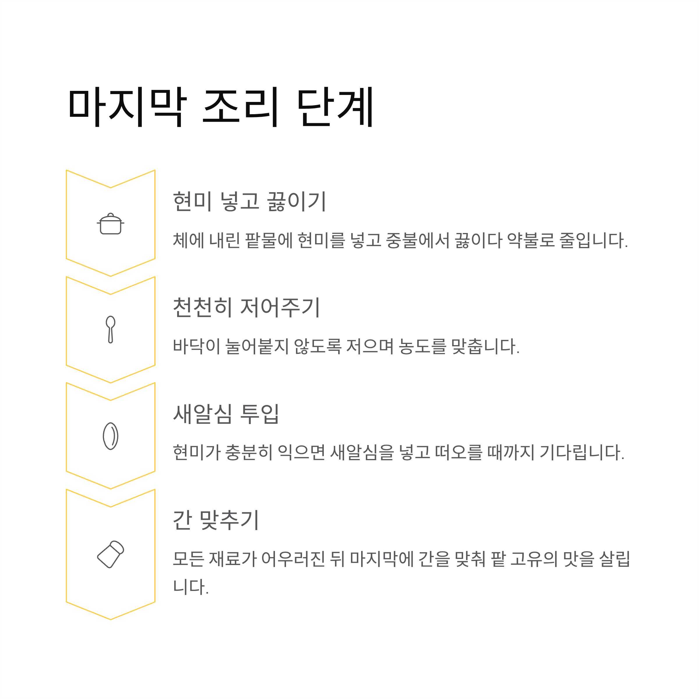 현미는 조리 전 충분히 불려두는 것이 좋아요. 최소 몇 시간 정도 물에 담가 두면 팥죽에 넣었을 때 익는 속도가 일정해집니다. 팥죽 국물에 현미를 넣고 함께 끓이면 팥의 고소함이 자연스럽게 배어들어 전체 맛이 안정적으로 어우러집니다.