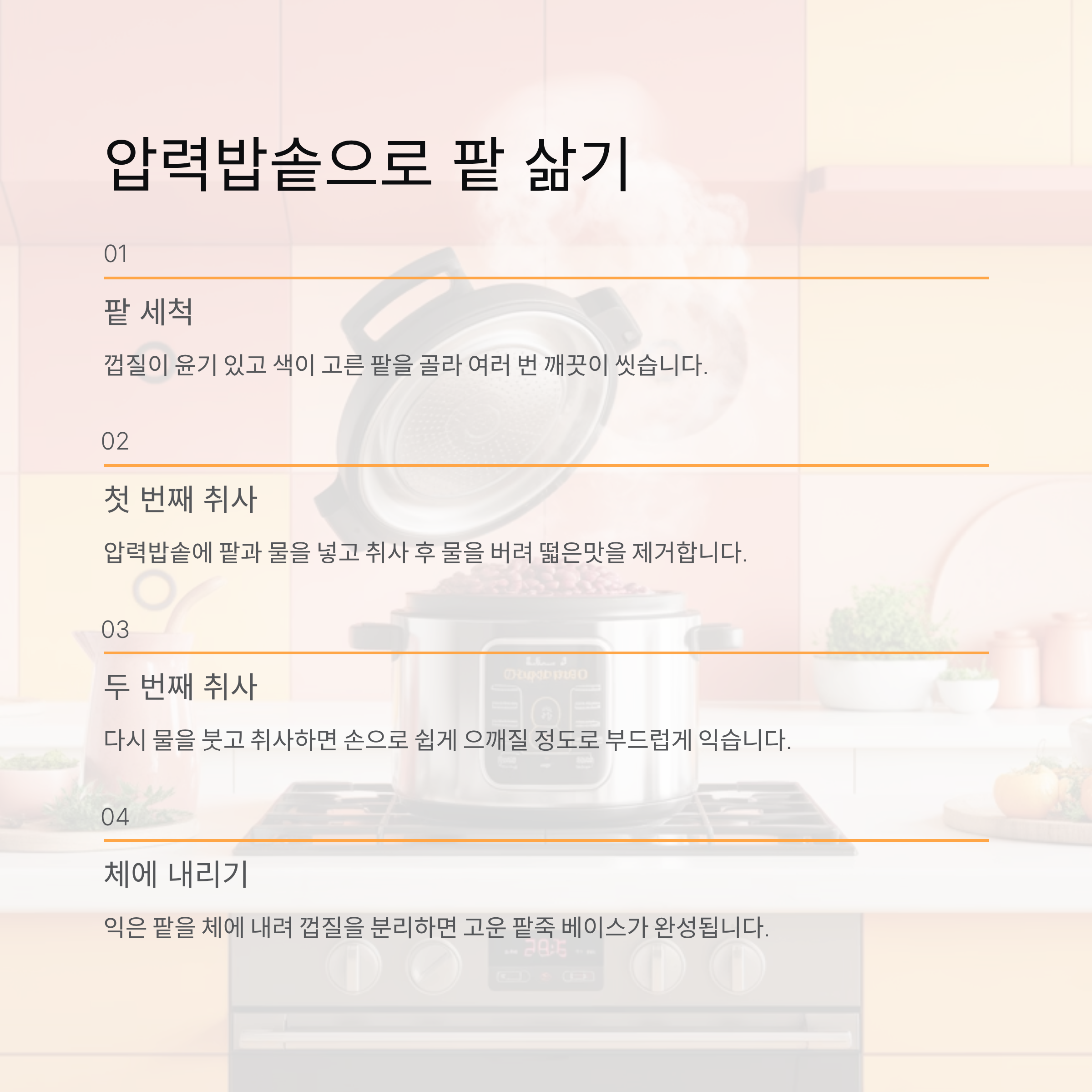 팥죽 맛을 좌우하는 핵심은 여전히 팥입니다. 껍질이 윤기 있고 색이 고른 팥을 고르는 것이 중요해요. 팥은 여러 번 씻어 불순물을 제거한 뒤 바로 삶는 방식으로 진행해도 무방합니다. 불리는 과정 없이도 충분히 익힐 수 있다는 점에서 압력밥솥 활용이 특히 편리합니다.