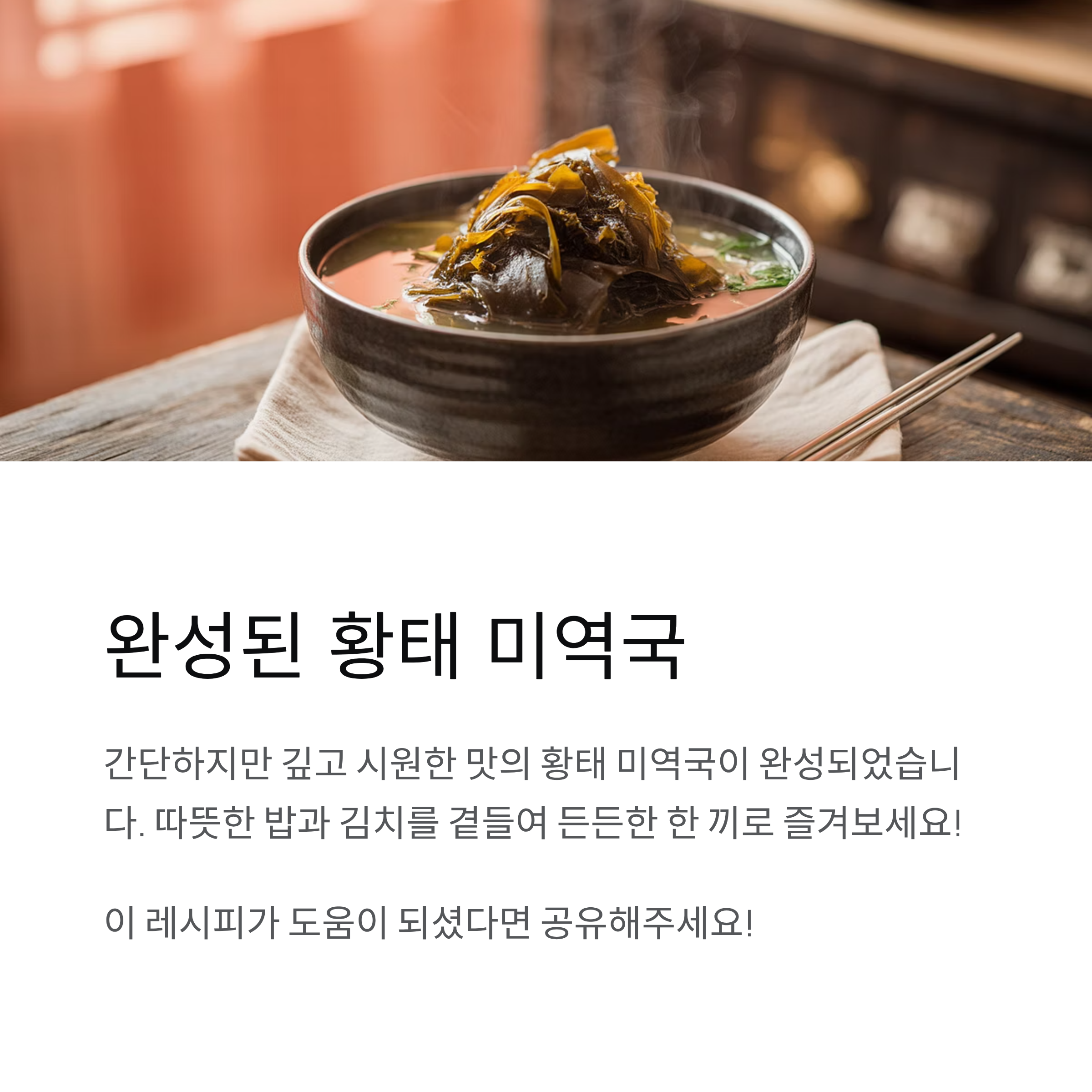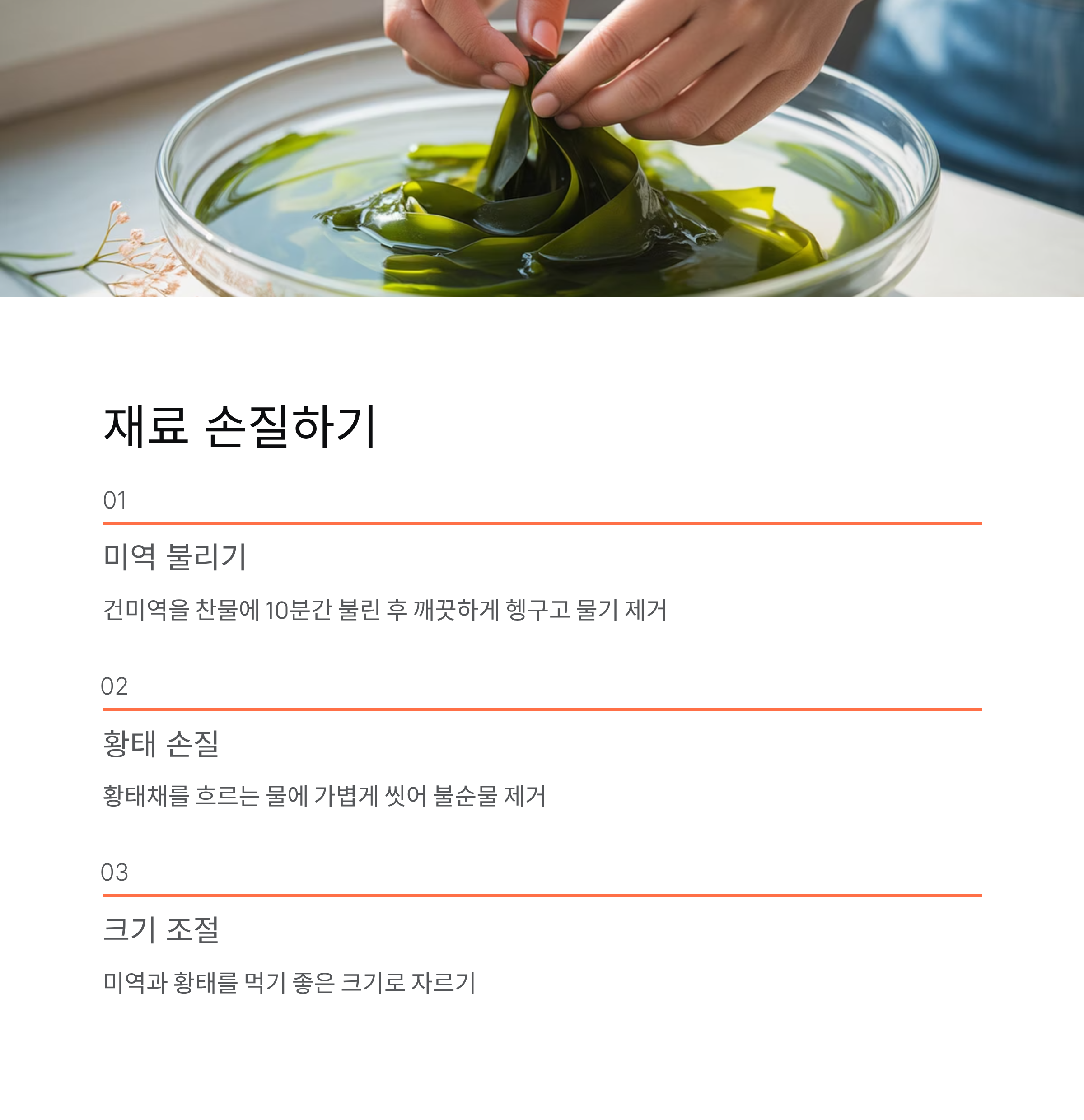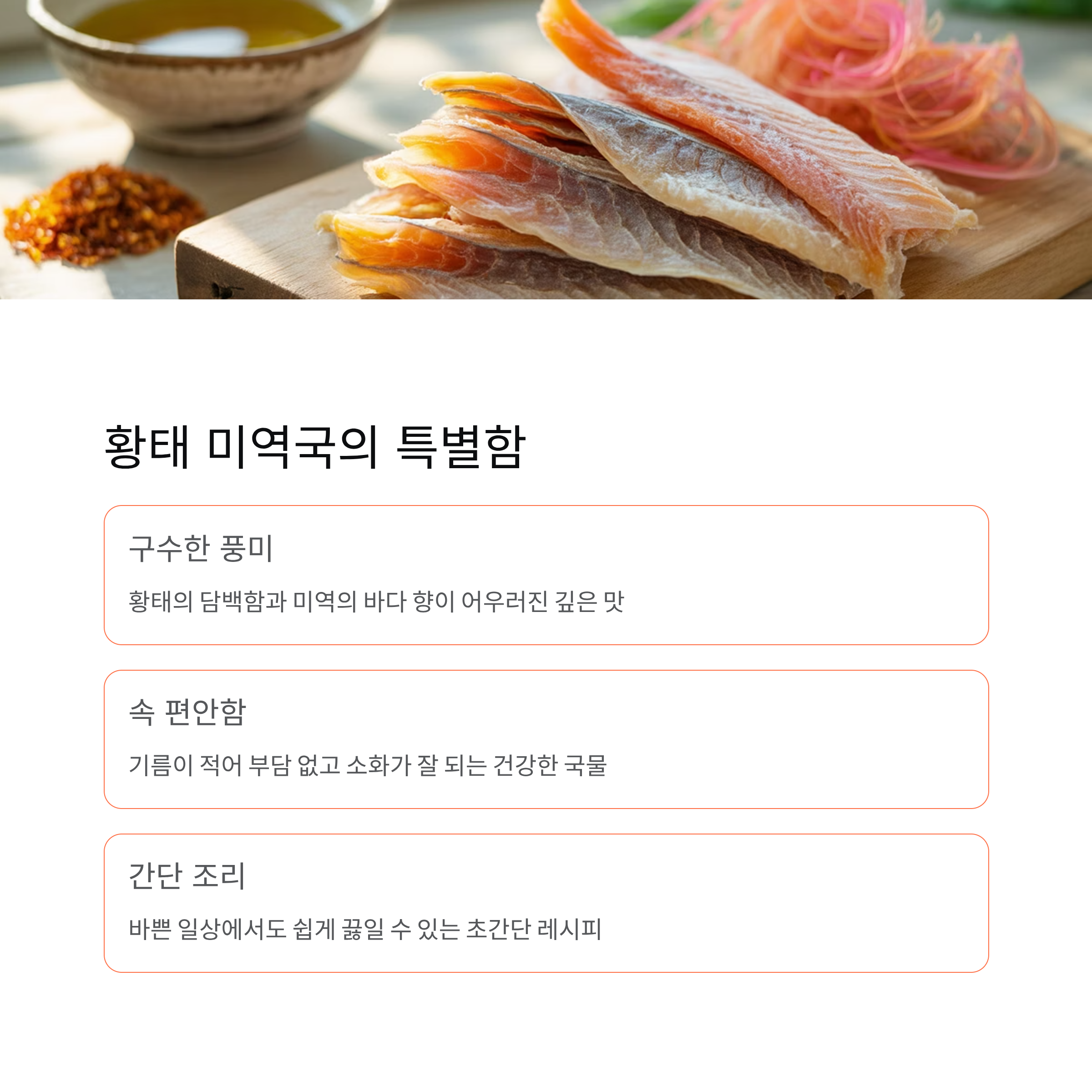 특히 황태 미역국은 재료가 단순하면서도 조리 과정이 간단해 바쁜 일상에서 부담 없이 끓일 수 있는 초간단 레시피입니다.