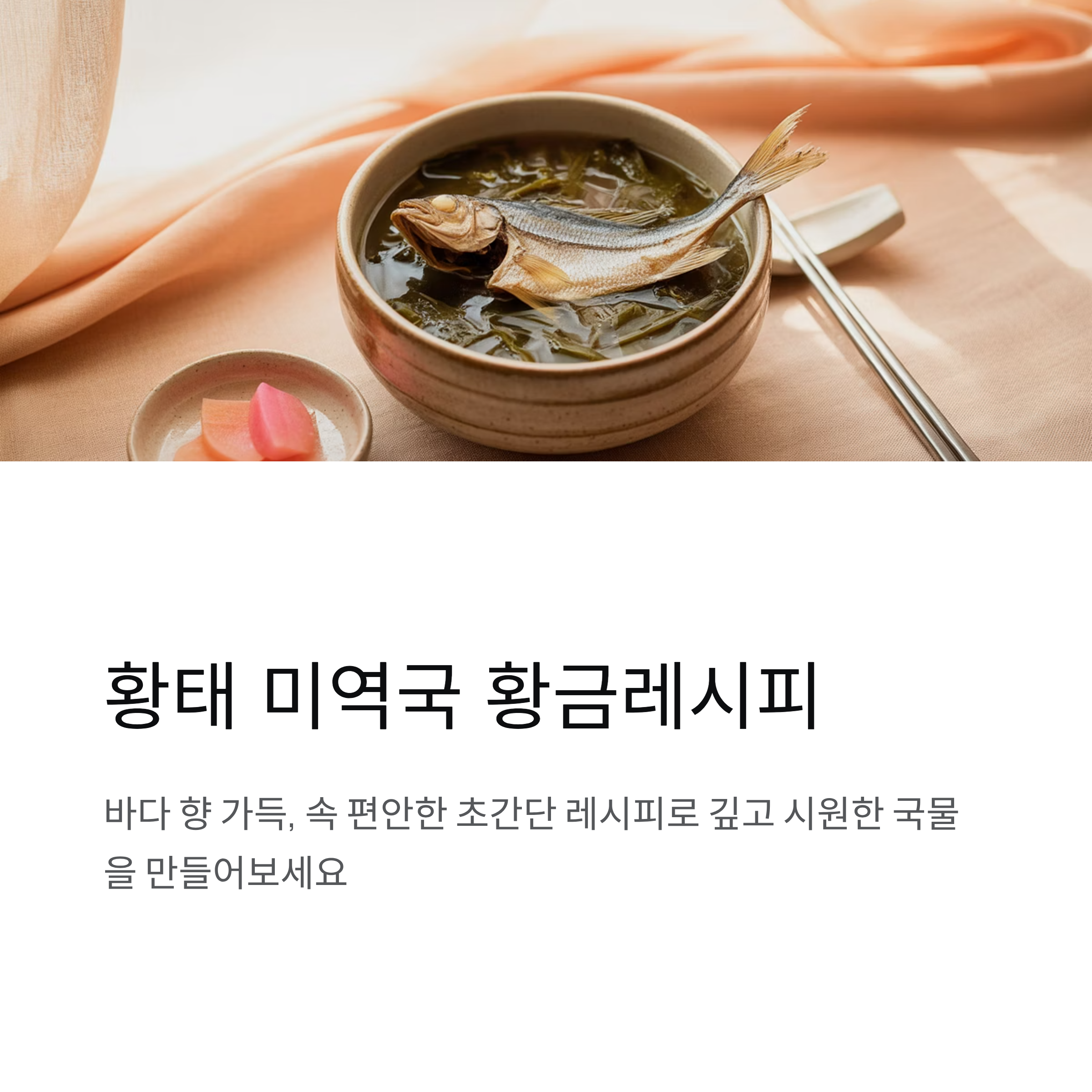 미역과 함께 끓이면 바다의 향과 황태의 담백함이 어우러져 속이 편안한 국물이 완성됩니다.