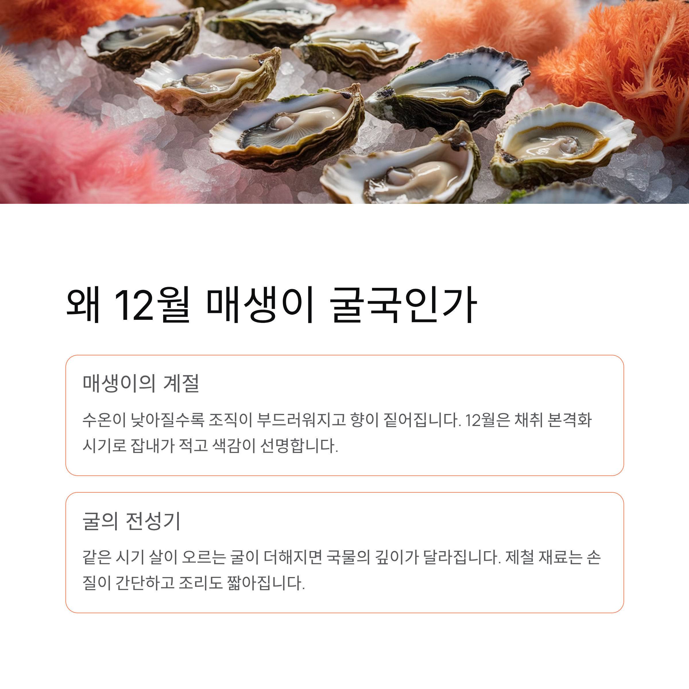 12월이 되면 자연스럽게 떠오르는 음식이 있습니다. 바로 매생이 굴국입니다. 차가운 바닷물에서 자란 매생이와 제철 굴이 만나 깊고 담백한 국물 맛을 만들어내죠. 오늘은 단순한 요리 설명이 아니라, 왜 이 조합이 겨울에 어울리는지, 어떤 순서로 끓여야 맛이 살아나는지까지 인과관계를 중심으로 자연스럽게 풀어보겠습니다. 집에서 따라 해도 실패 확률이 낮은 방식으로 정리해 드립니다.