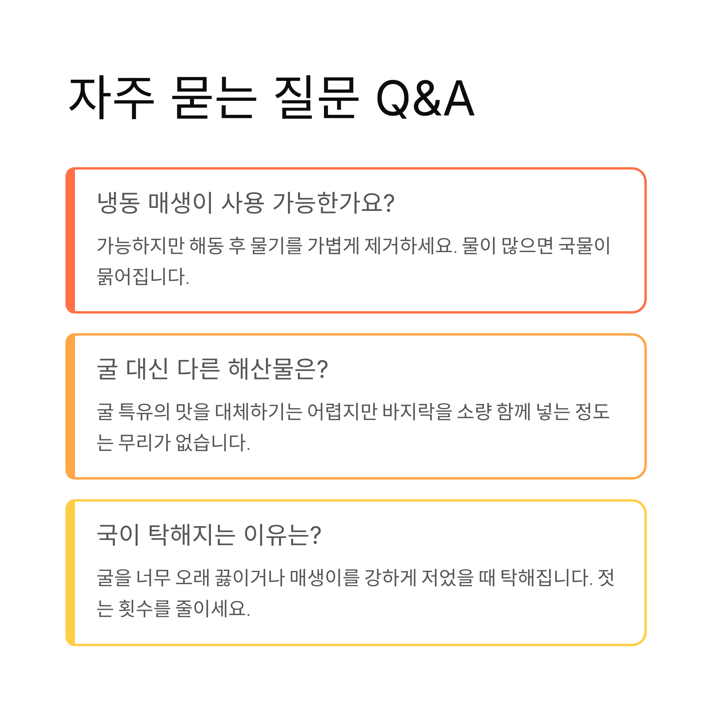 많은 분들이 매생이 굴국이 비리다고 느끼는 이유는 굴을 오래 끓이기 때문입니다. 굴은 짧은 시간만 익혀야 단맛이 살아납니다. 또한 매생이를 손으로 쥐어짜듯 씻지 않고 그대로 넣는 경우도 실패 원인입니다. 물에 풀어 여러 번 헹궈주는 것만으로도 결과가 크게 달라집니다. 작은 과정이 전체 완성도를 바꿉니다.
