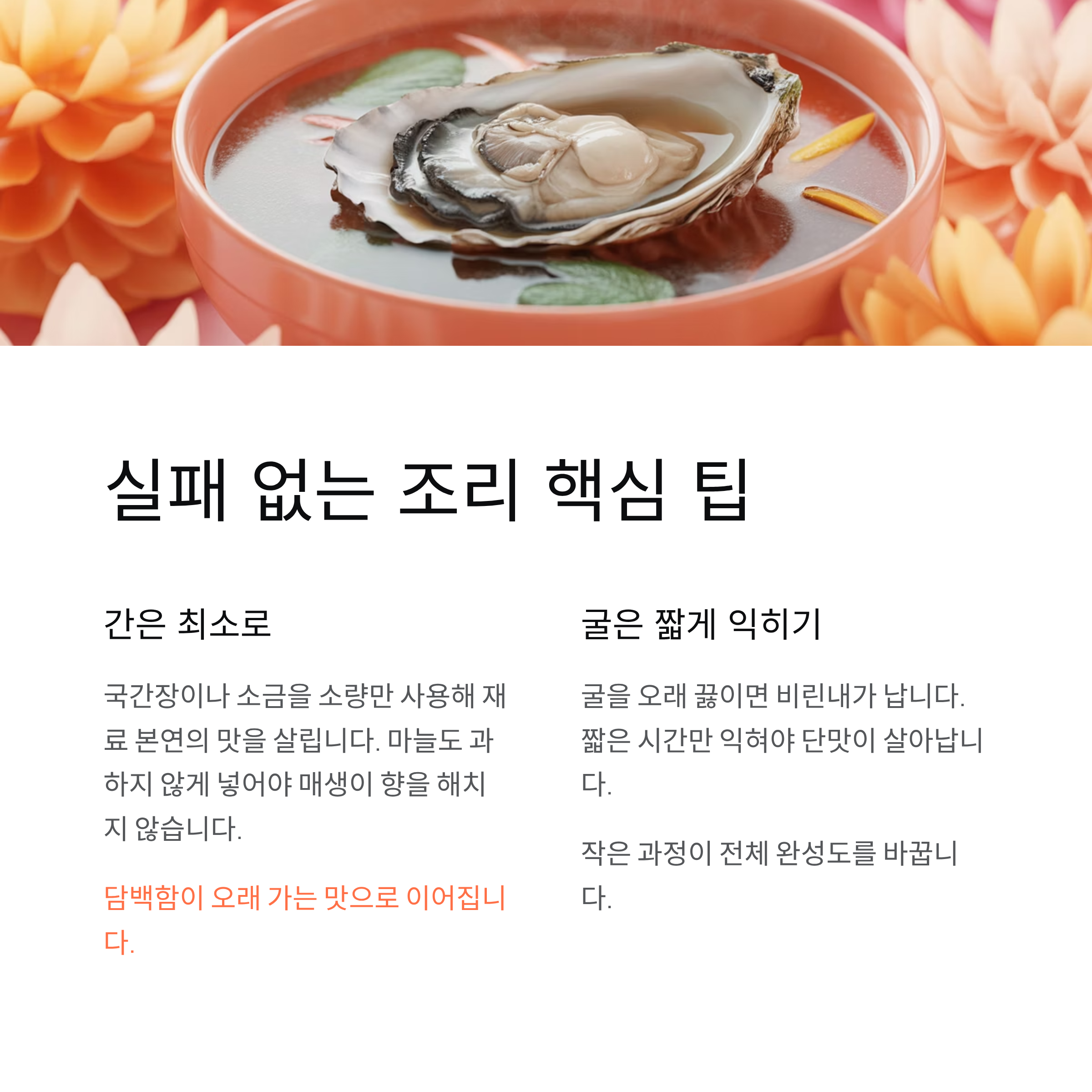 많은 분들이 매생이 굴국이 비리다고 느끼는 이유는 굴을 오래 끓이기 때문입니다. 굴은 짧은 시간만 익혀야 단맛이 살아납니다. 또한 매생이를 손으로 쥐어짜듯 씻지 않고 그대로 넣는 경우도 실패 원인입니다. 물에 풀어 여러 번 헹궈주는 것만으로도 결과가 크게 달라집니다. 작은 과정이 전체 완성도를 바꿉니다.
