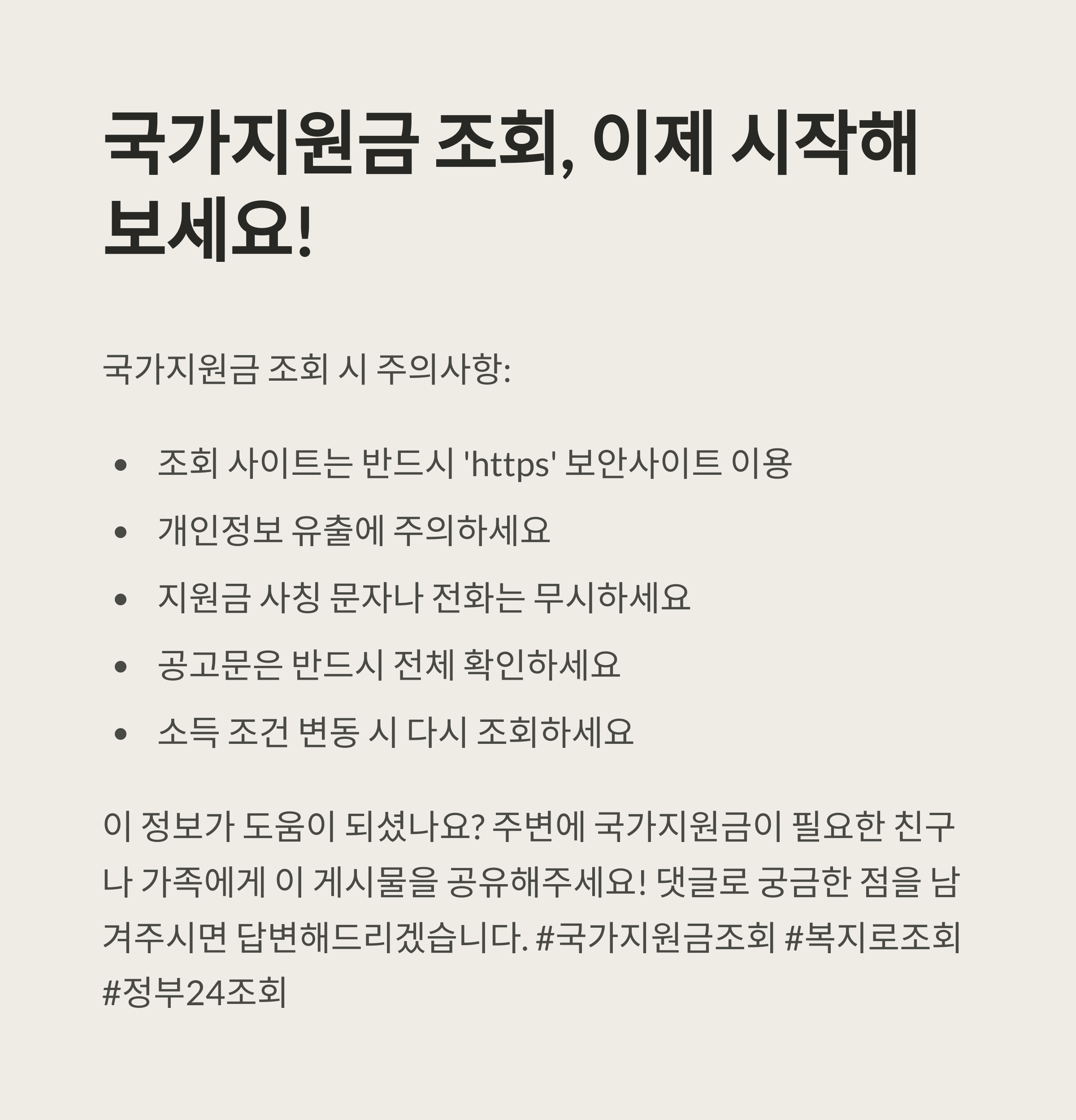 "국가지원금 조회는 누구에게나 열려 있습니다. 포기하지 말고 꼭 확인해보세요!"