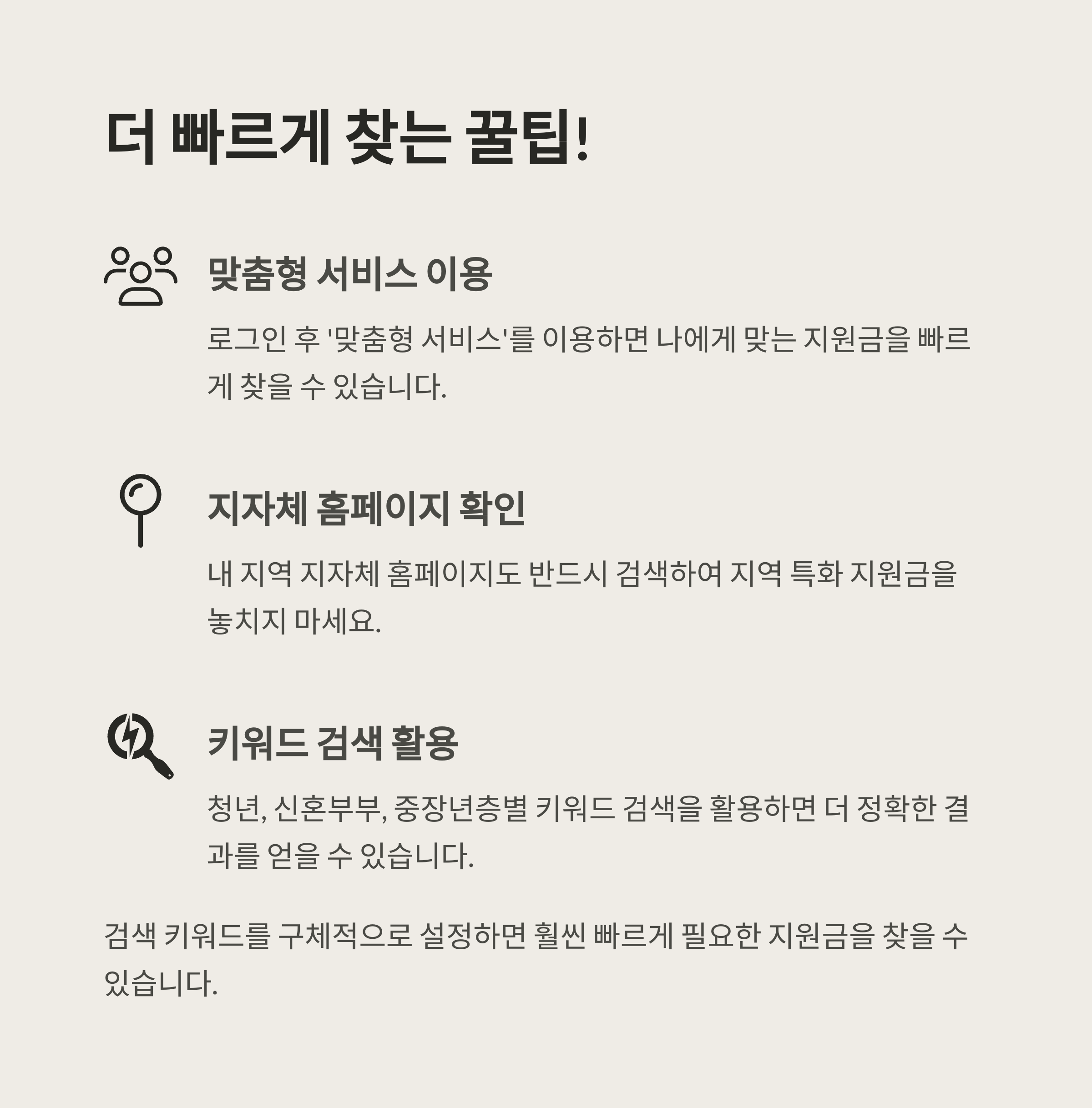 "검색 키워드를 구체적으로 설정하면 훨씬 빠르게 필요한 지원금을 찾을 수 있습니다."