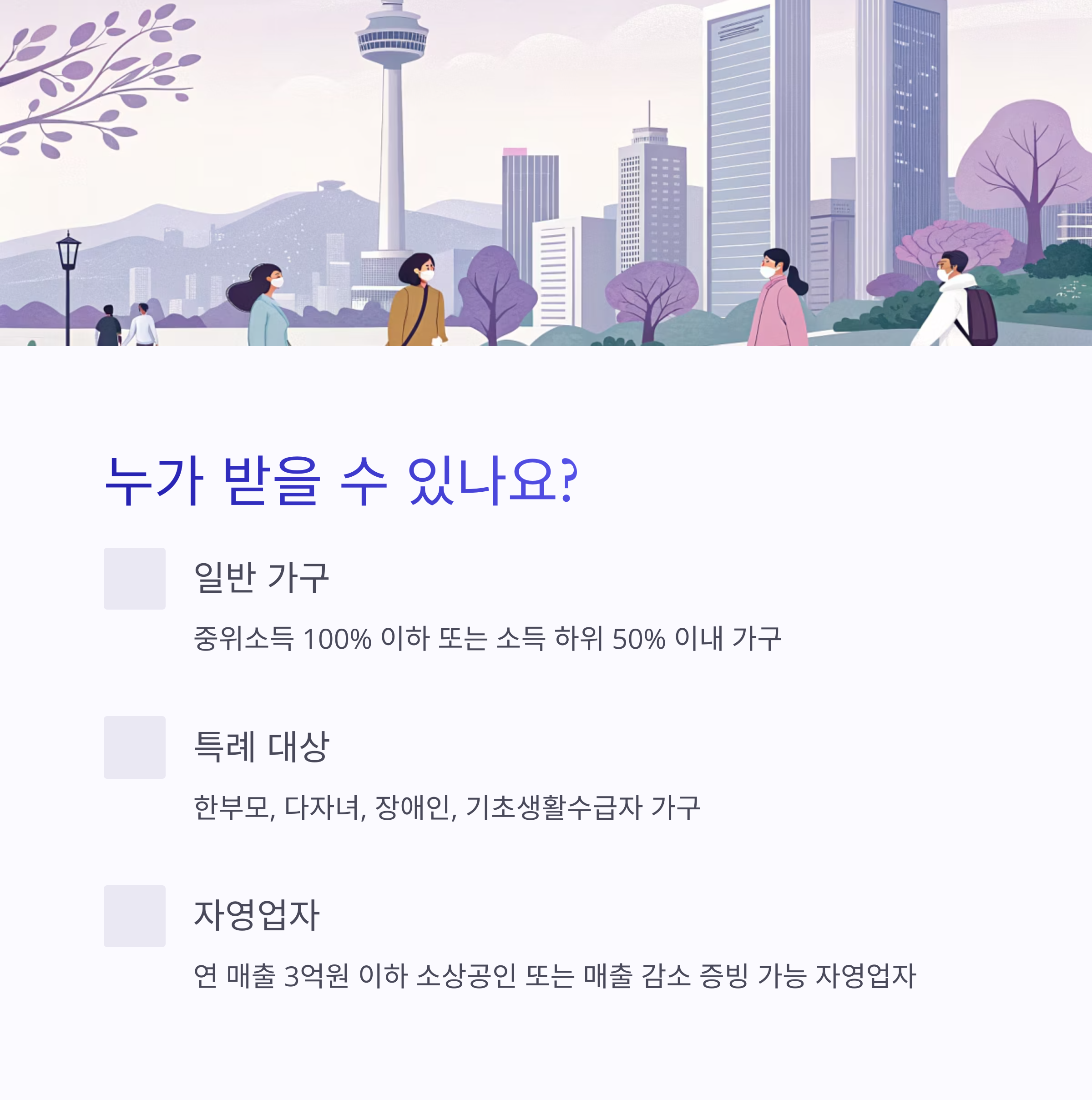 | 자영업자 지원 | 연 매출 3억 원 이하 소상공인 또는 매출 감소 증빙 시 |