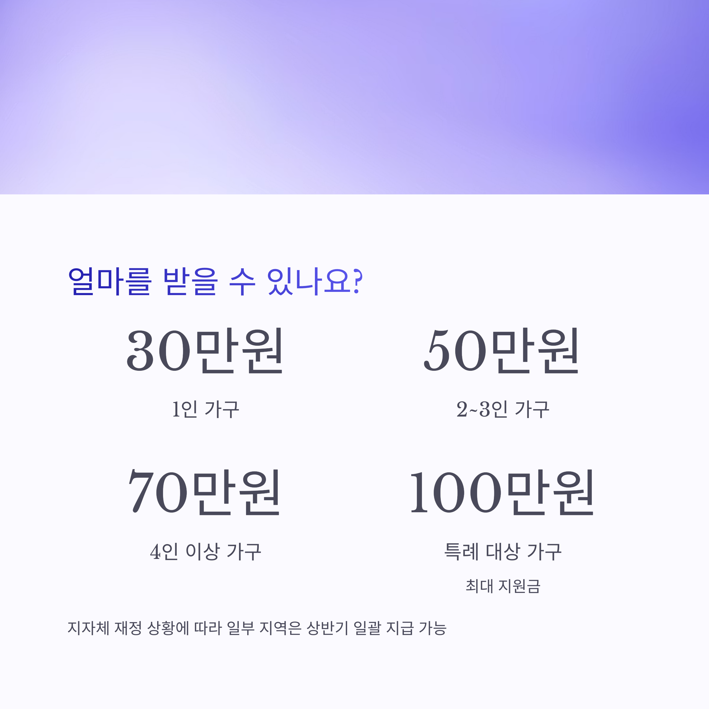 가구원 수와 특성에 따라 차등 지급되며, 1회 또는 2회 분할 지급됩니다.