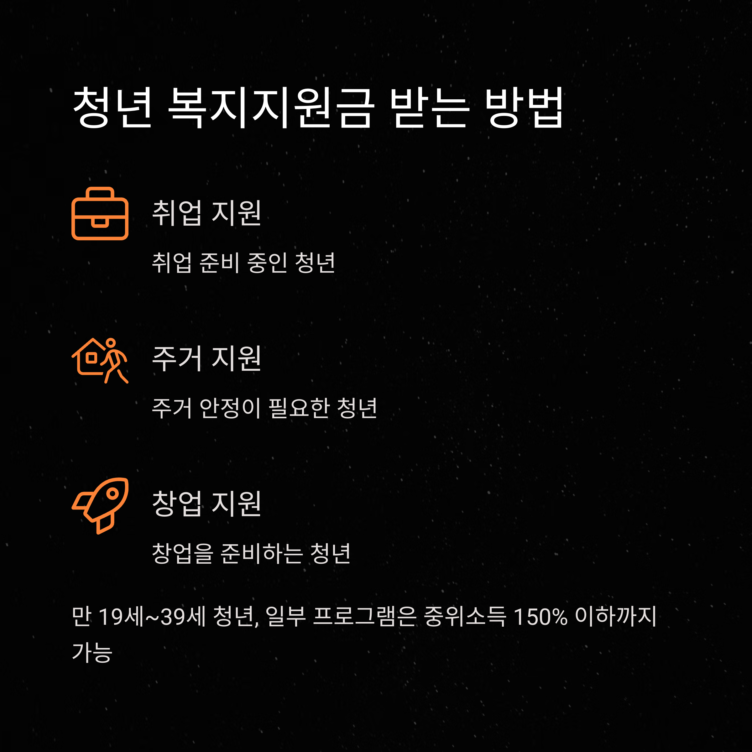 | 청년 | 19세~39세 청년 | 취업, 창업, 주거 지원금 |