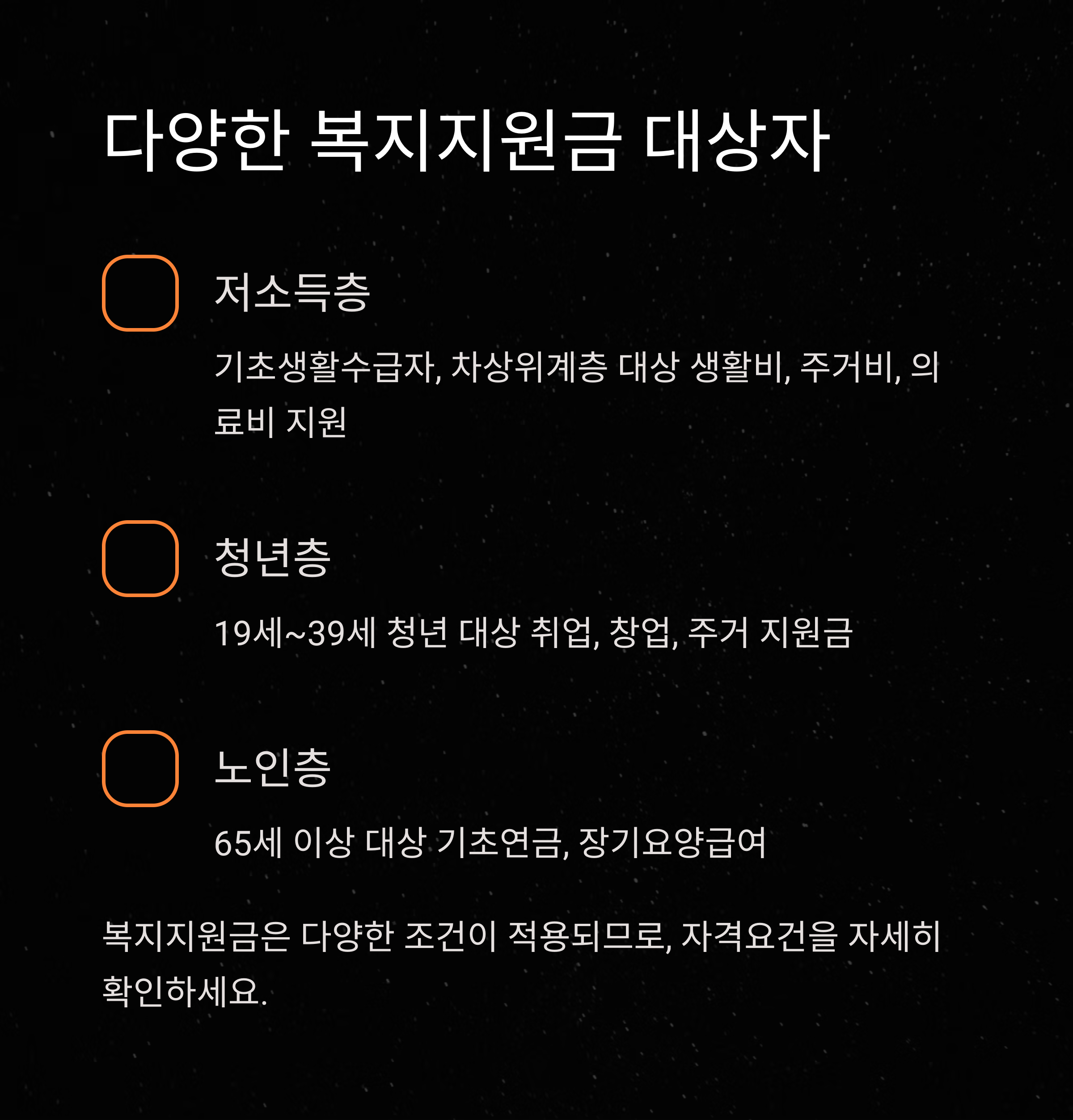 "복지지원금 대상은 다양한 조건이 적용되므로, 꼭 자격요건을 자세히 확인해야 합니다."