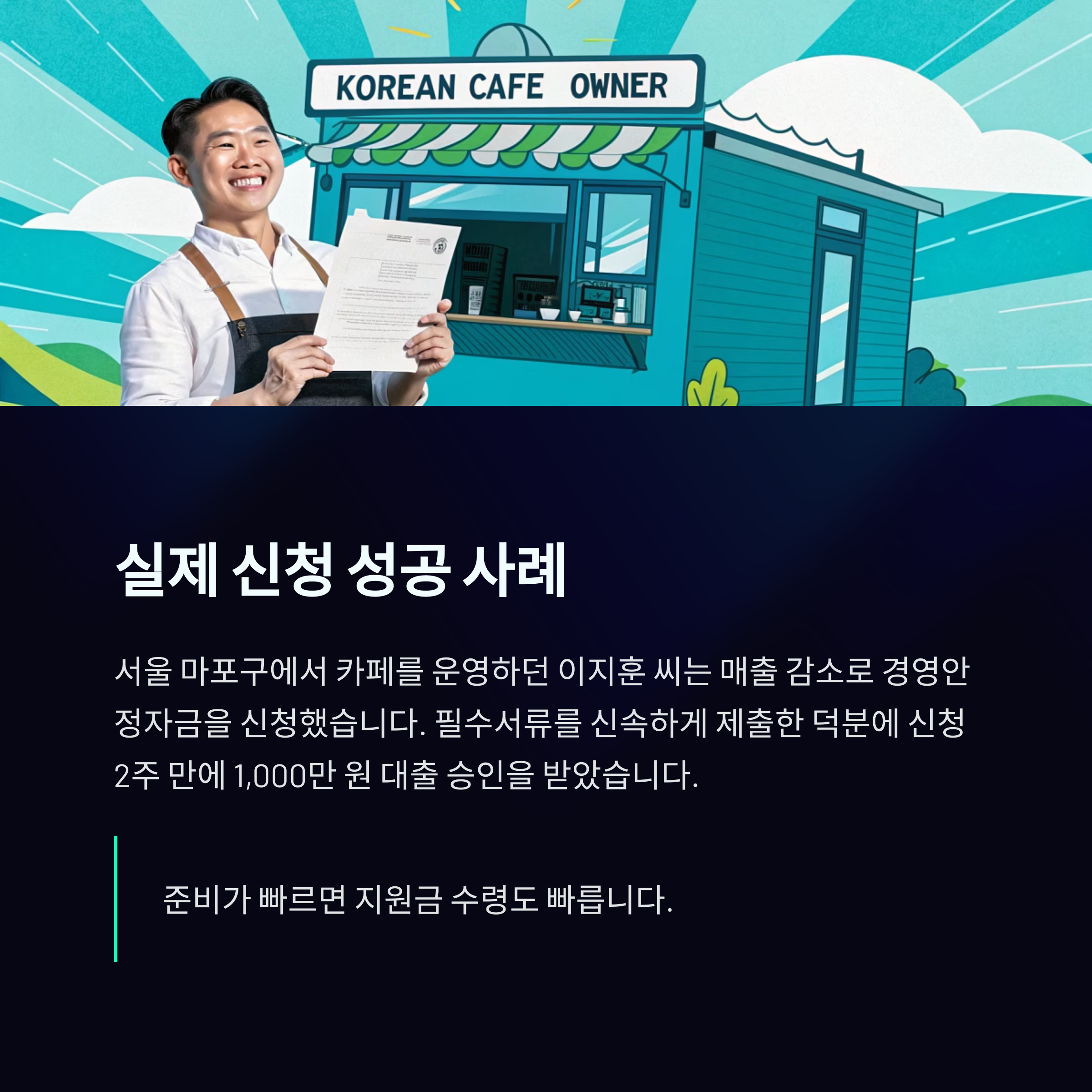 신청 2주 만에 1,000만 원 대출 승인을 받아 운영을 이어갈 수 있었습니다."