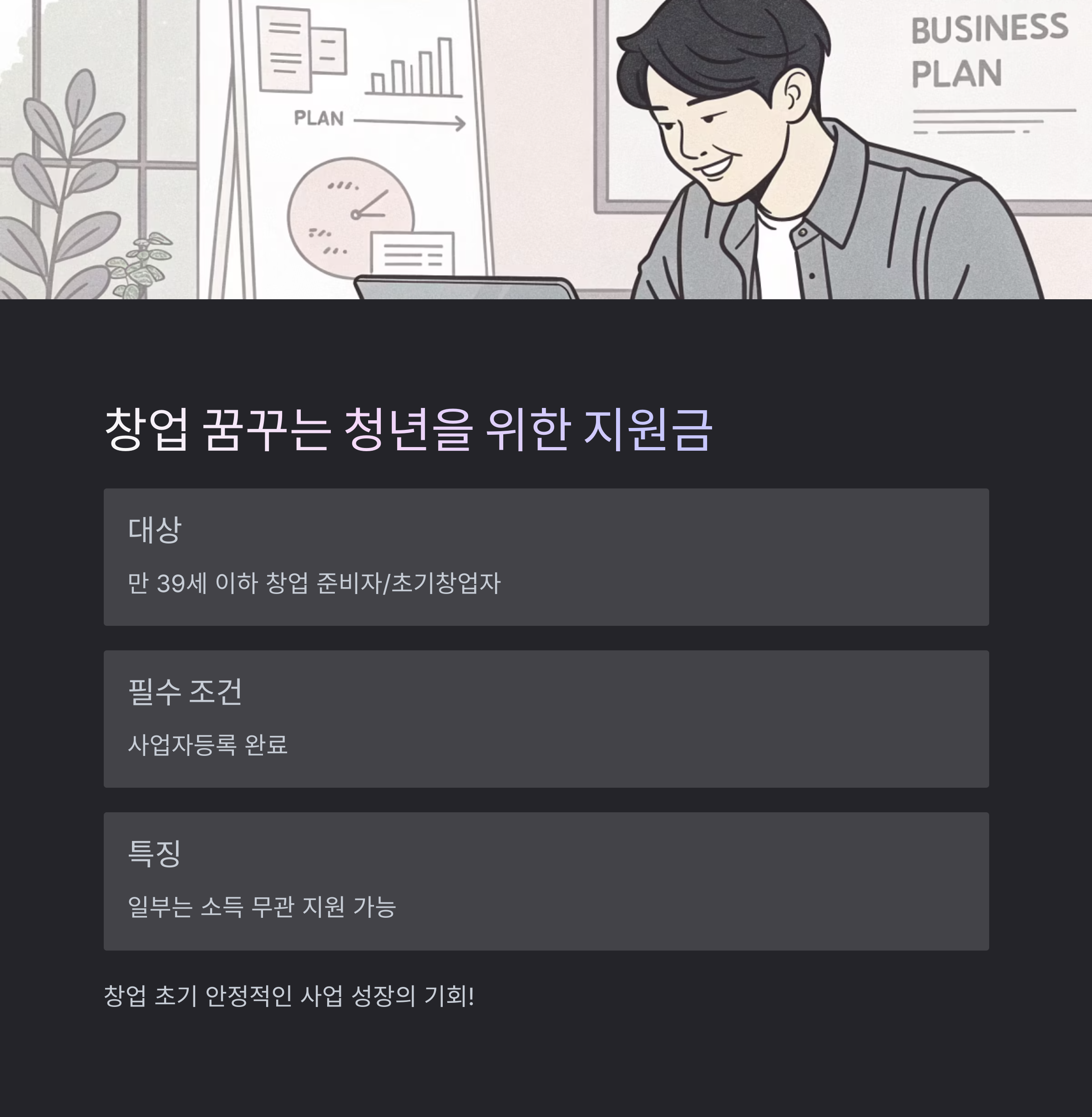 | 청년창업지원금 | 만 39세 이하 | 무관 | 창업 예정 또는 초기창업자 |