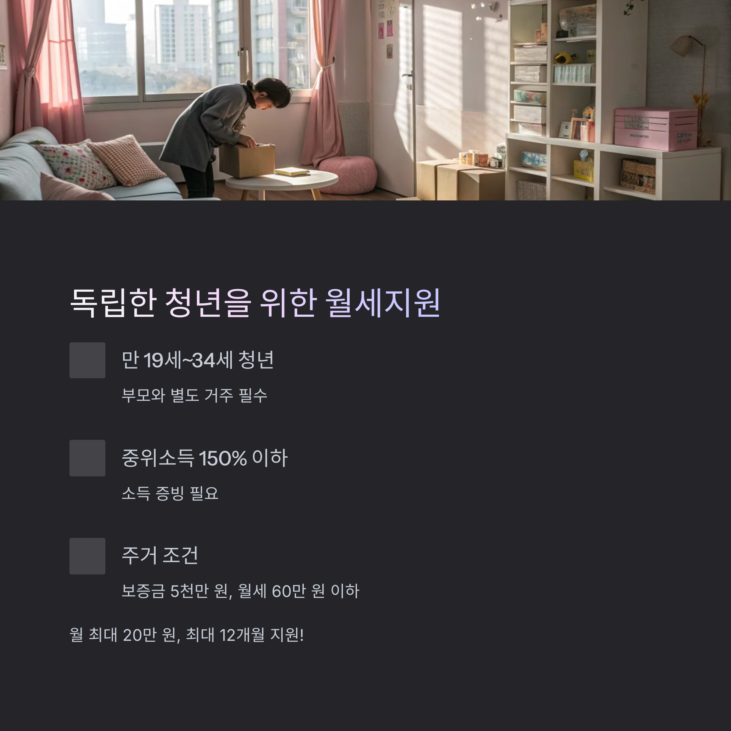 | 청년월세지원 | 만 19세~34세 | 중위소득 150% 이하 | 독립 거주 |