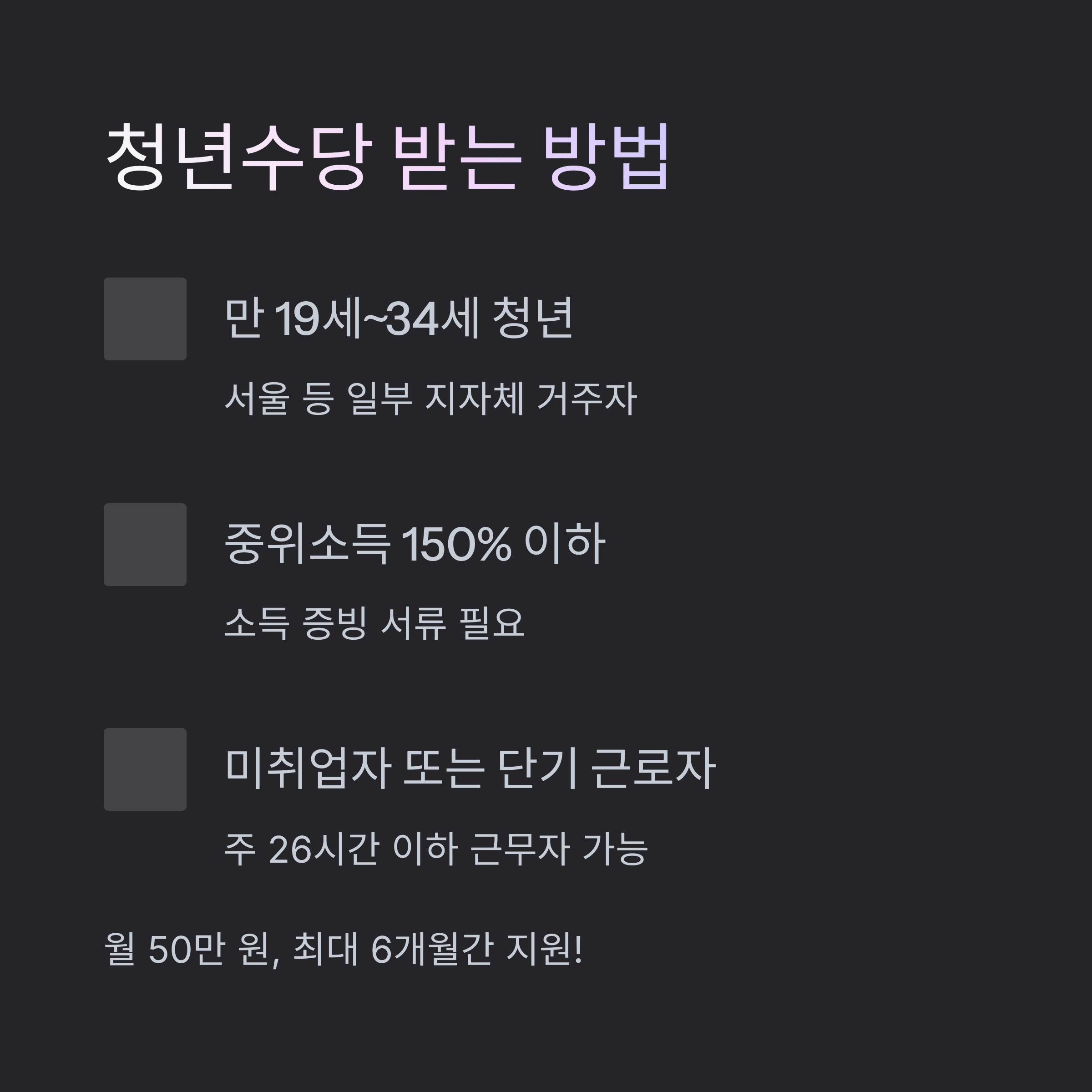 | 청년수당 | 만 19세~34세 | 중위소득 150% 이하 | 미취업 또는 단기 취업 |