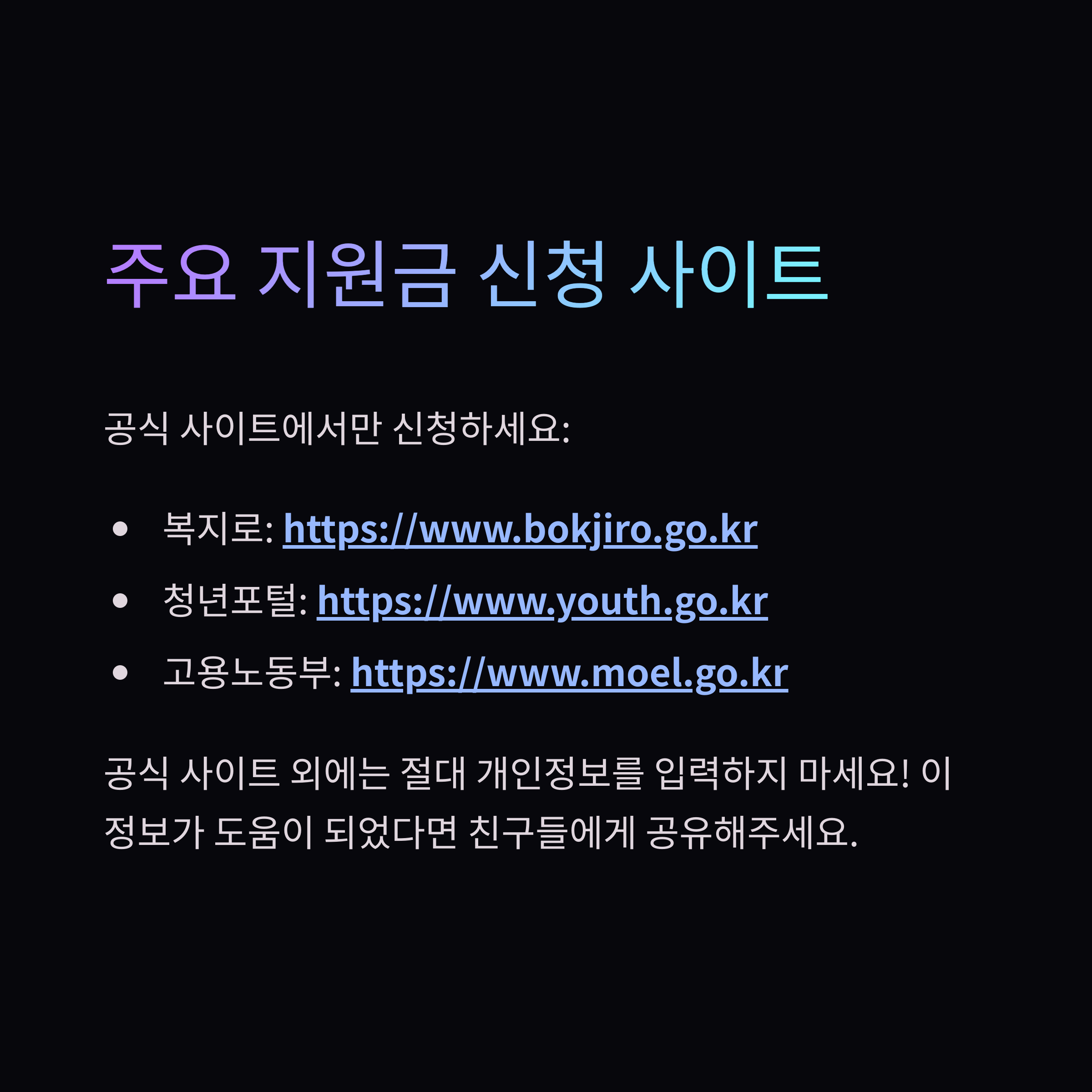"지원금 신청은 종류에 따라 절차가 달라지므로 반드시 공식 사이트를 확인하세요."