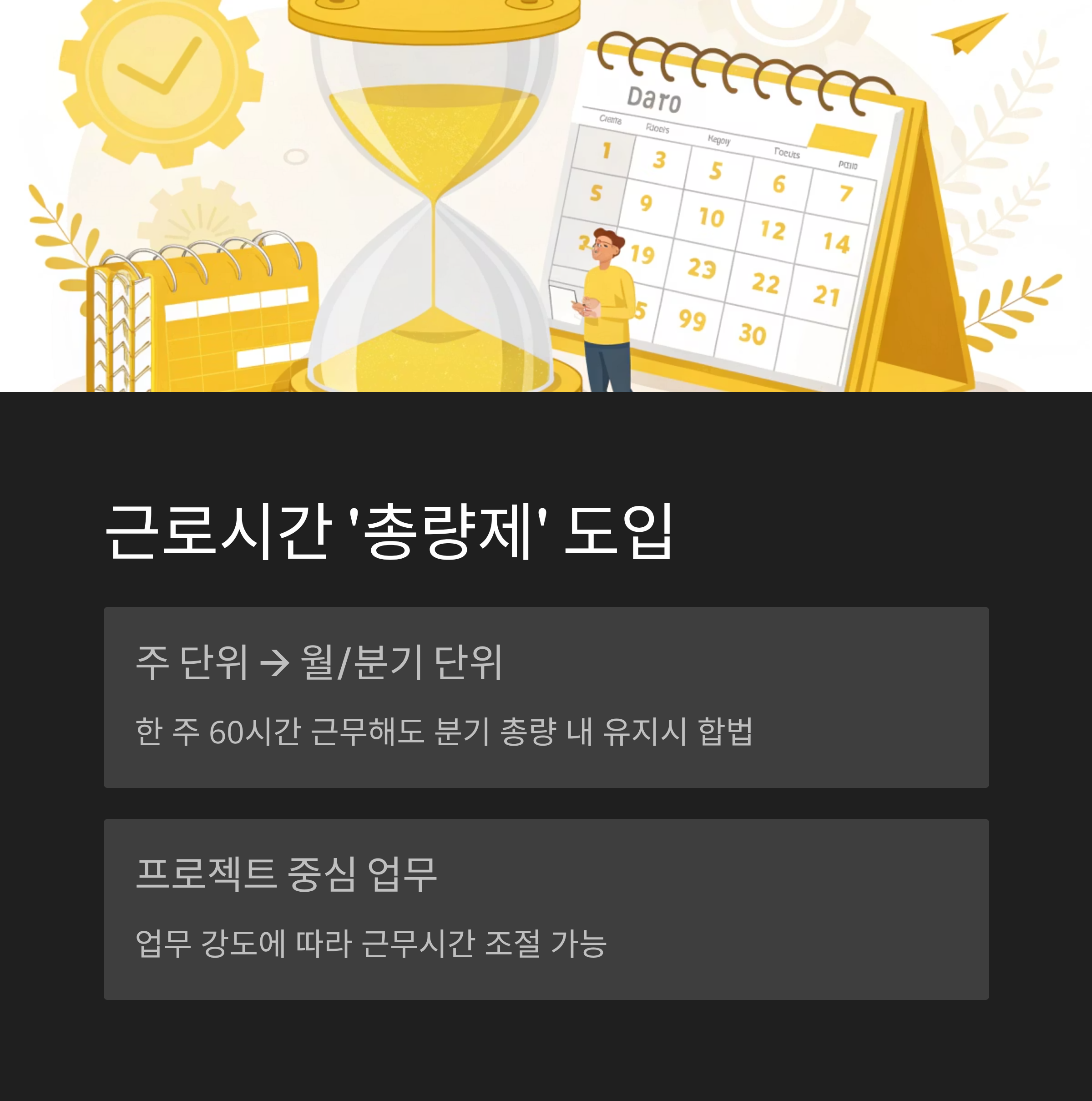 주 단위가 아닌 월 단위, 분기 단위로 근로시간을 관리하는 ‘총량제’ 개념이