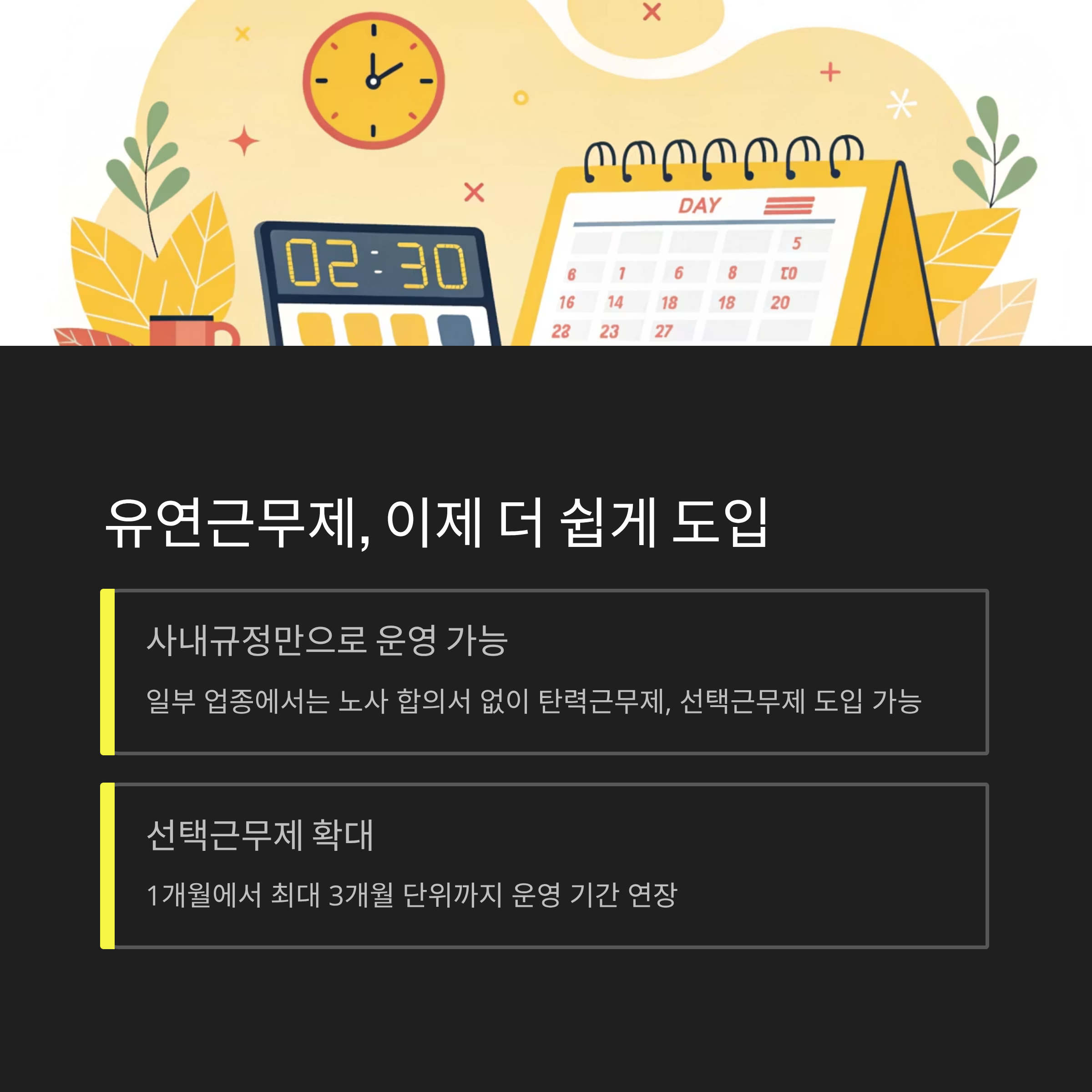 개정안에 따라 일부 업종에서는 사내규정만으로도 탄력근무제,