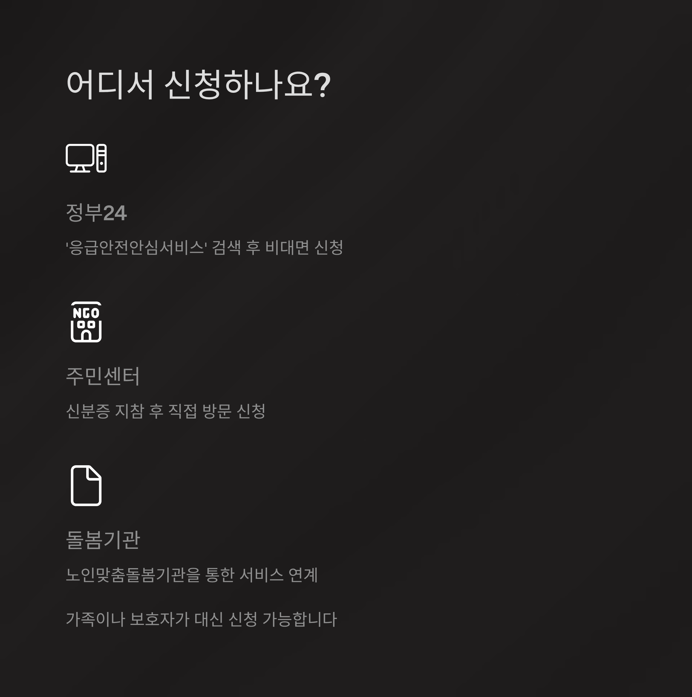 | 정부24 | ‘응급안전안심서비스’ 검색 후 비대면 신청 가능 |