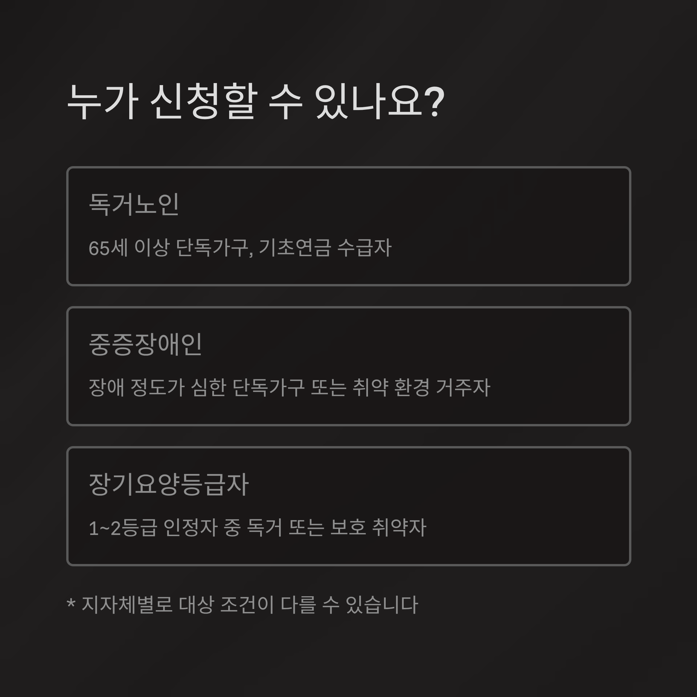 | 장기요양등급자 | 1~2등급 인정자 중 독거 또는 보호 취약자 |