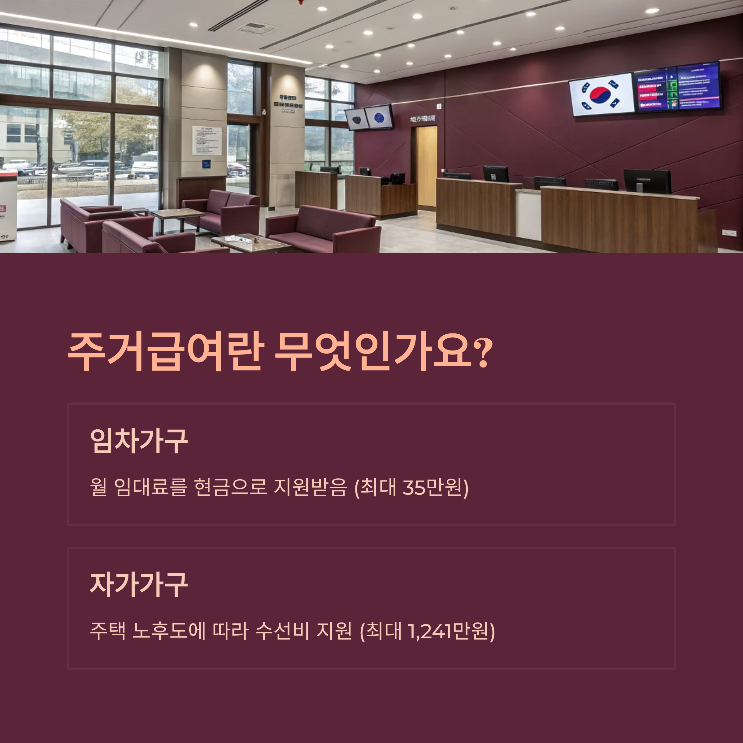 | 자가 가구 | 주택 노후도에 따라 수선비 지원 (최대 1,241만 원) |