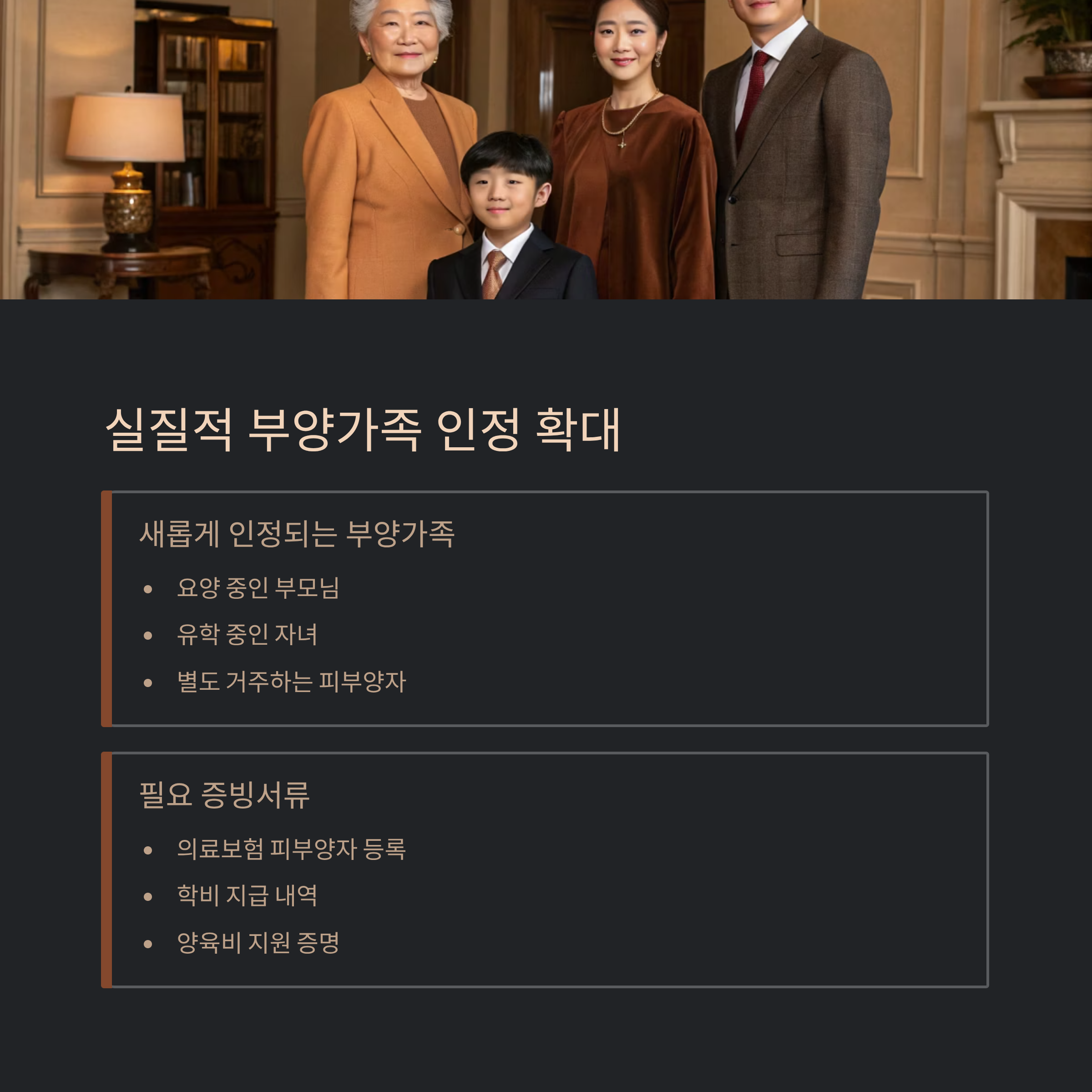 | 부양가족 인정 범위 | 주민등록상 동거인 | 피부양 증빙 시 분리 거주 가능 |