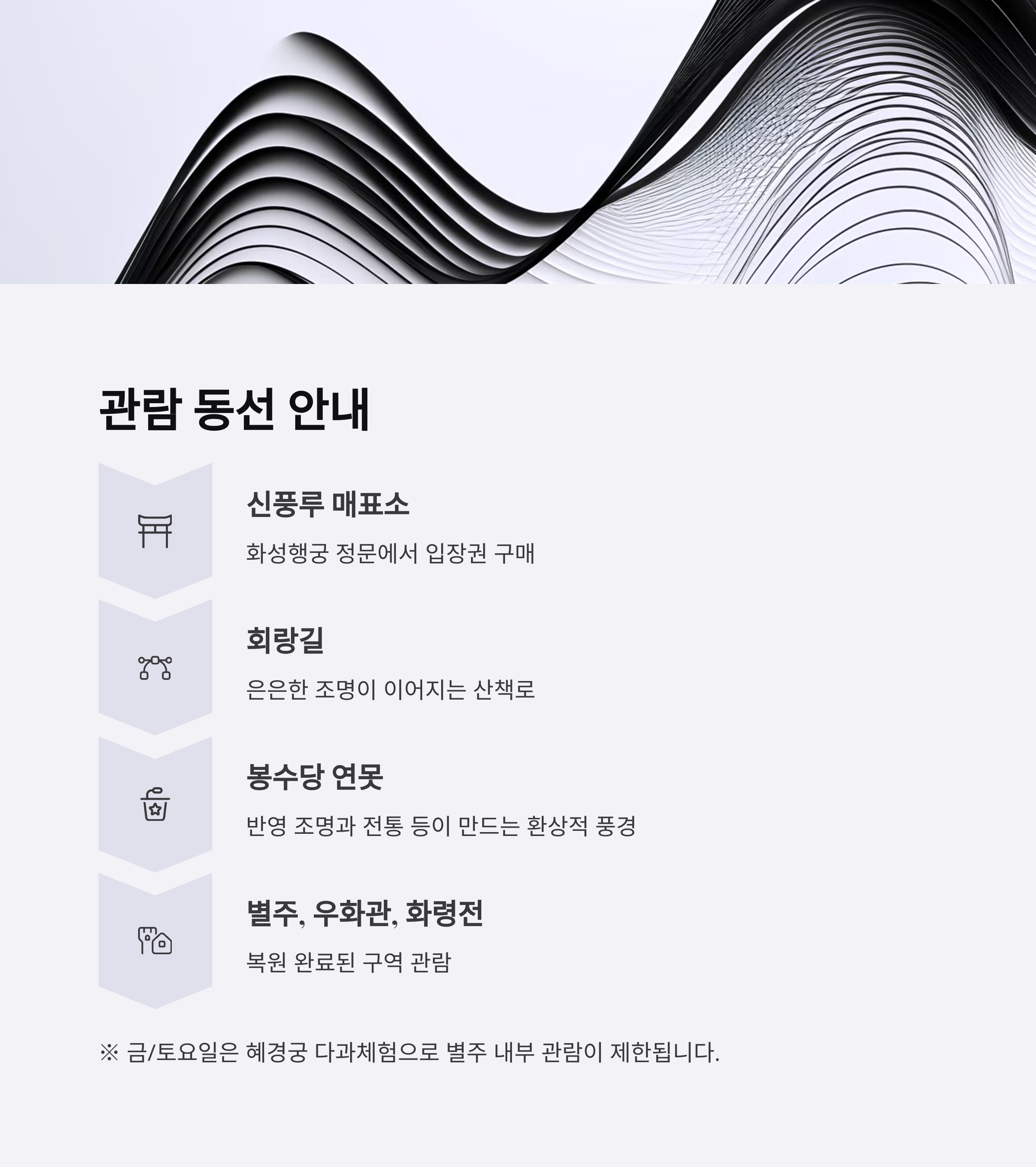 - 단, 금요일, 토요일은 혜경궁 다과체험 운영일로 인해 별주 내부 관람 제한