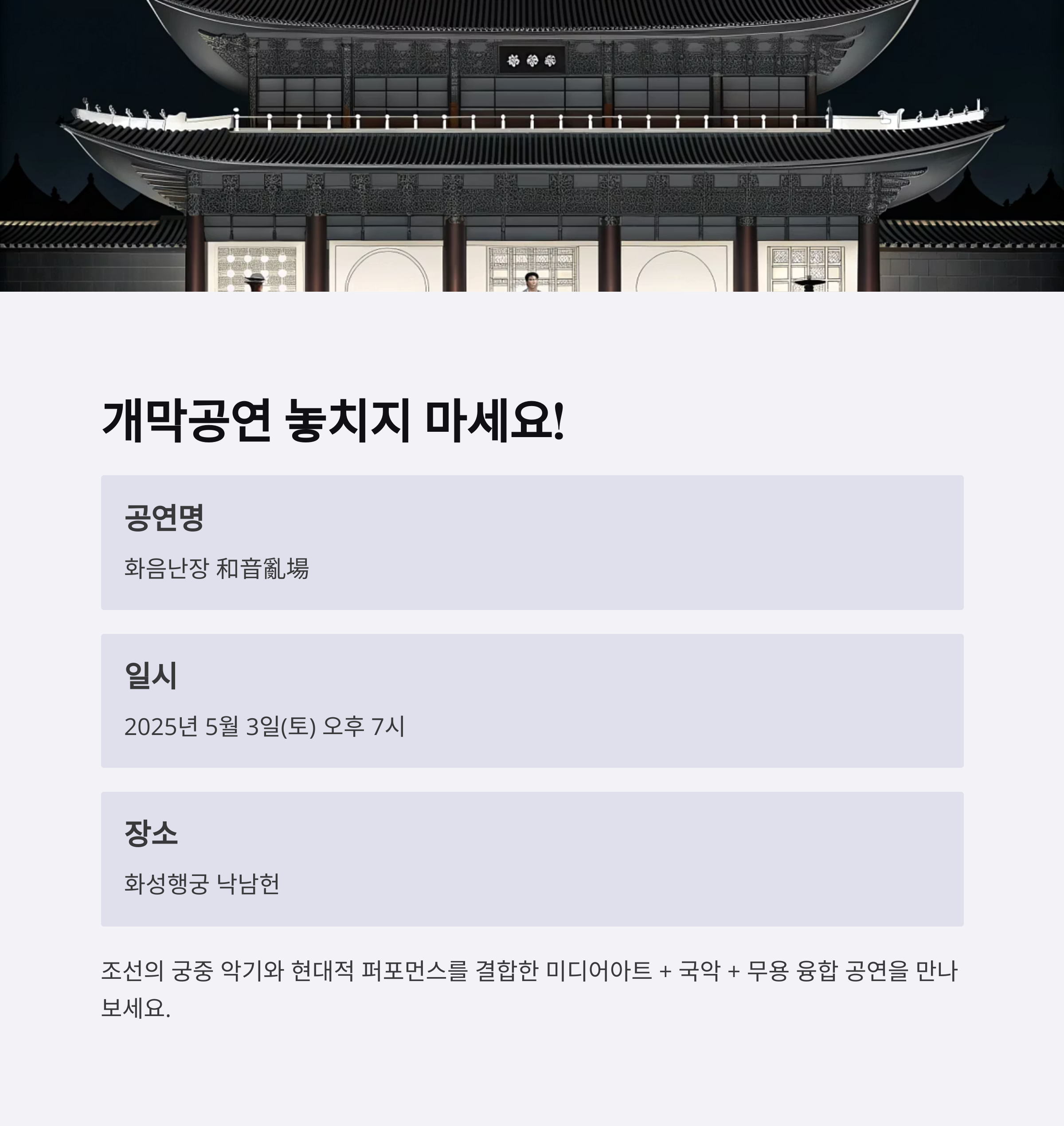 - 공연명: 2025 화성행궁 야간개장 개막공연 <화음난장 和音亂場>