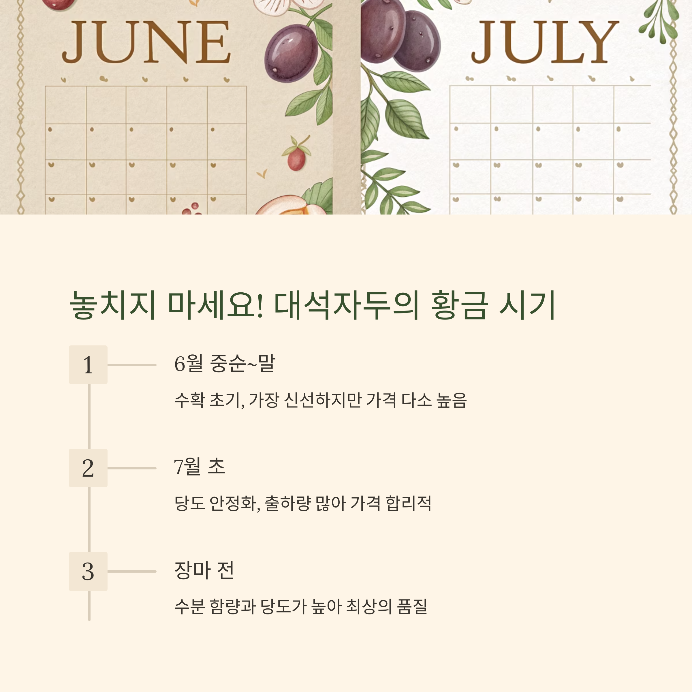 | 6월 중순~말 | 수확 초기, 가장 신선 | 가격 다소 높음 |