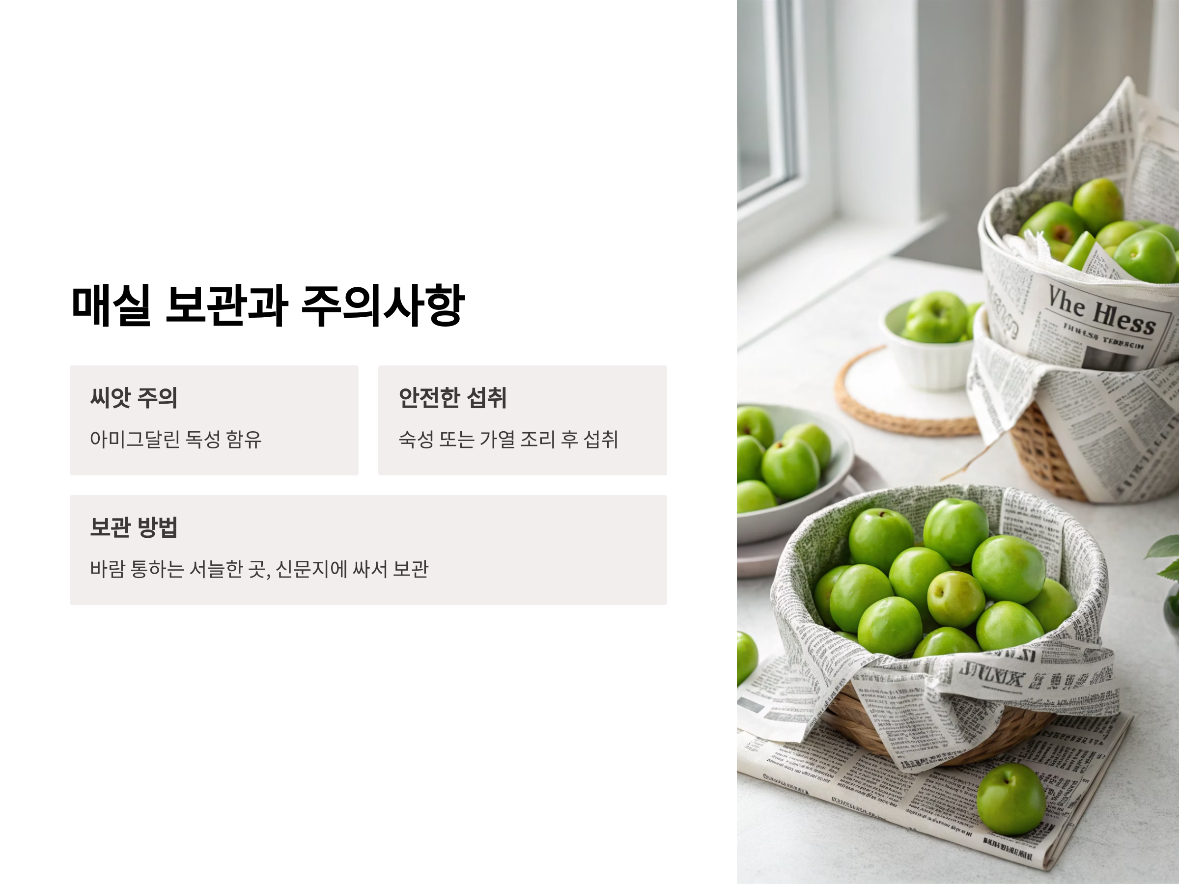 매실은 **씨앗에 독성(아미그달린)**이 있기 때문에