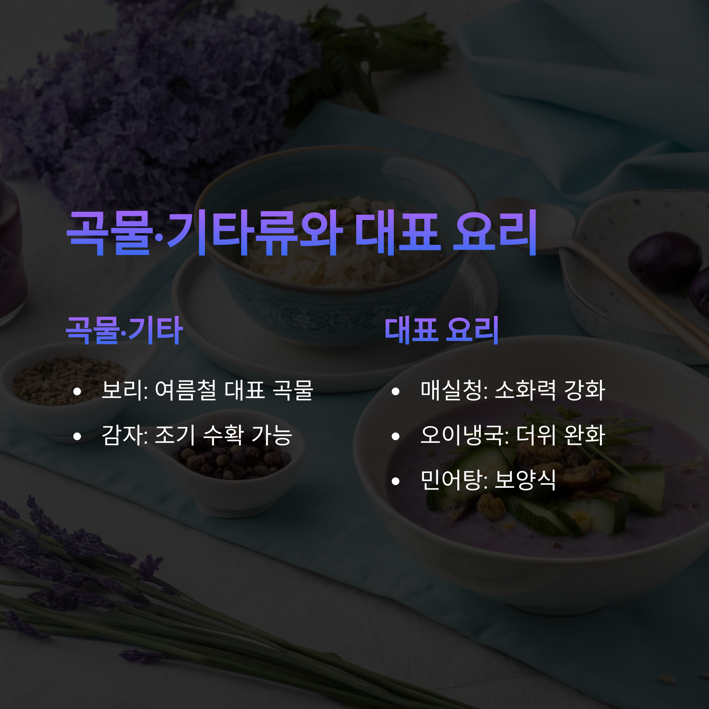 | 보리 | 여름철 대표 곡물 | 보리밥, 보리차 |